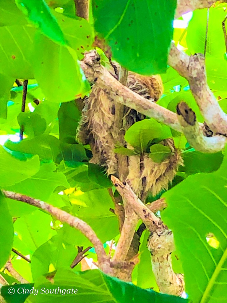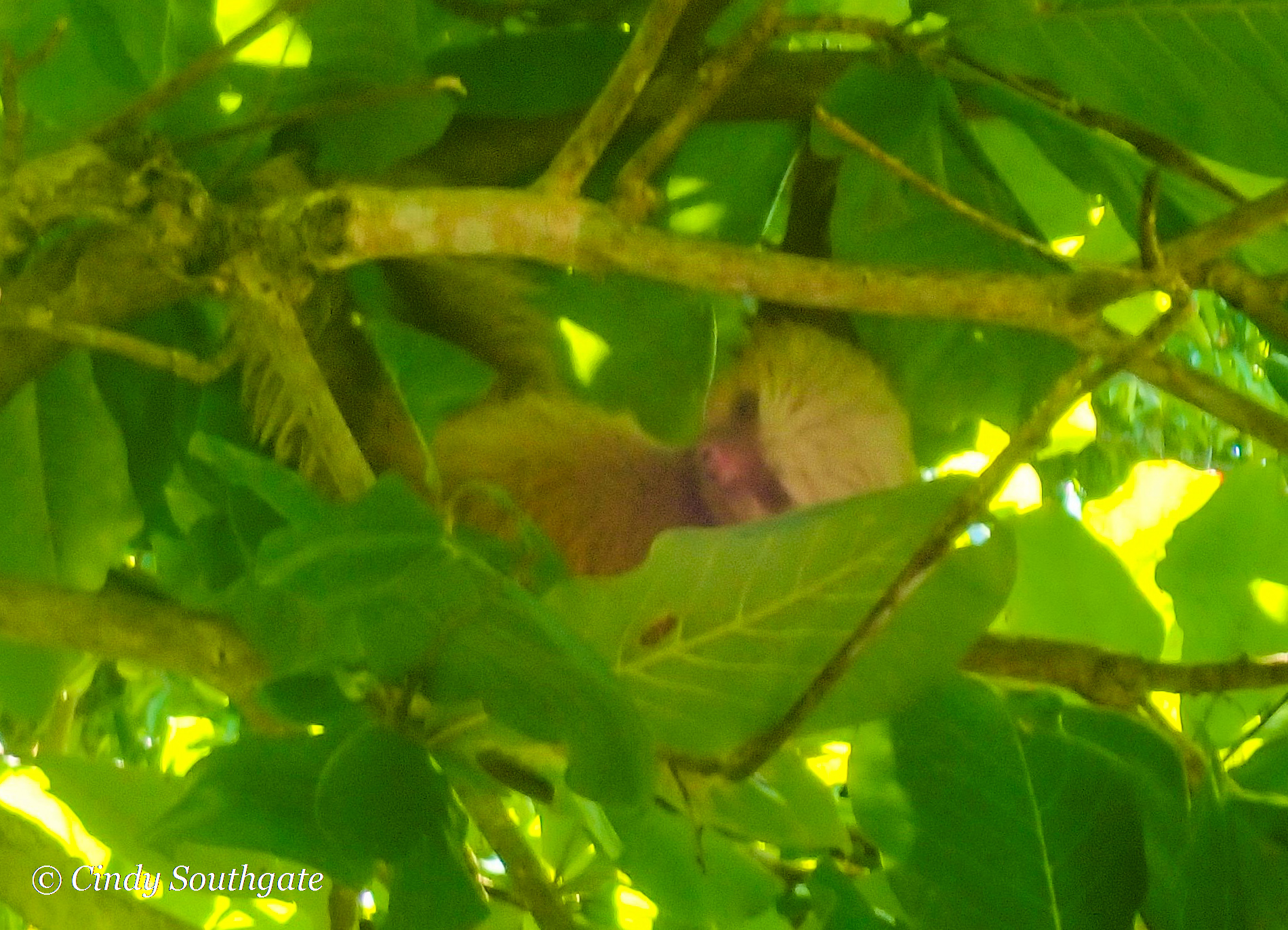Overnight we had had some rain. This is what the poor sloth looked like in the morning. I spent a lot of time watching her. She spent some time grooming herself until her fur was straightened out.