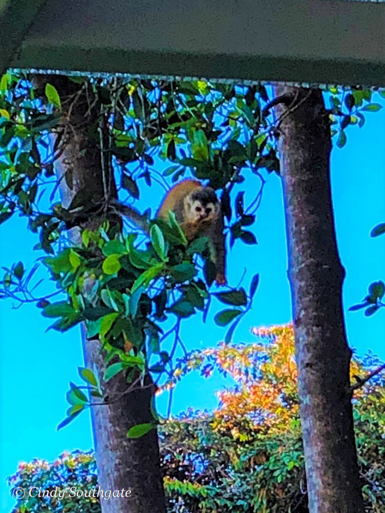 While we were eating there was a sudden racket on the plastic and partially see through roof. A troop of Squirrel Monkeys was passing through. We looked up and saw their shadows running across to the other side. They were chattering away and sounded a bit like birds.