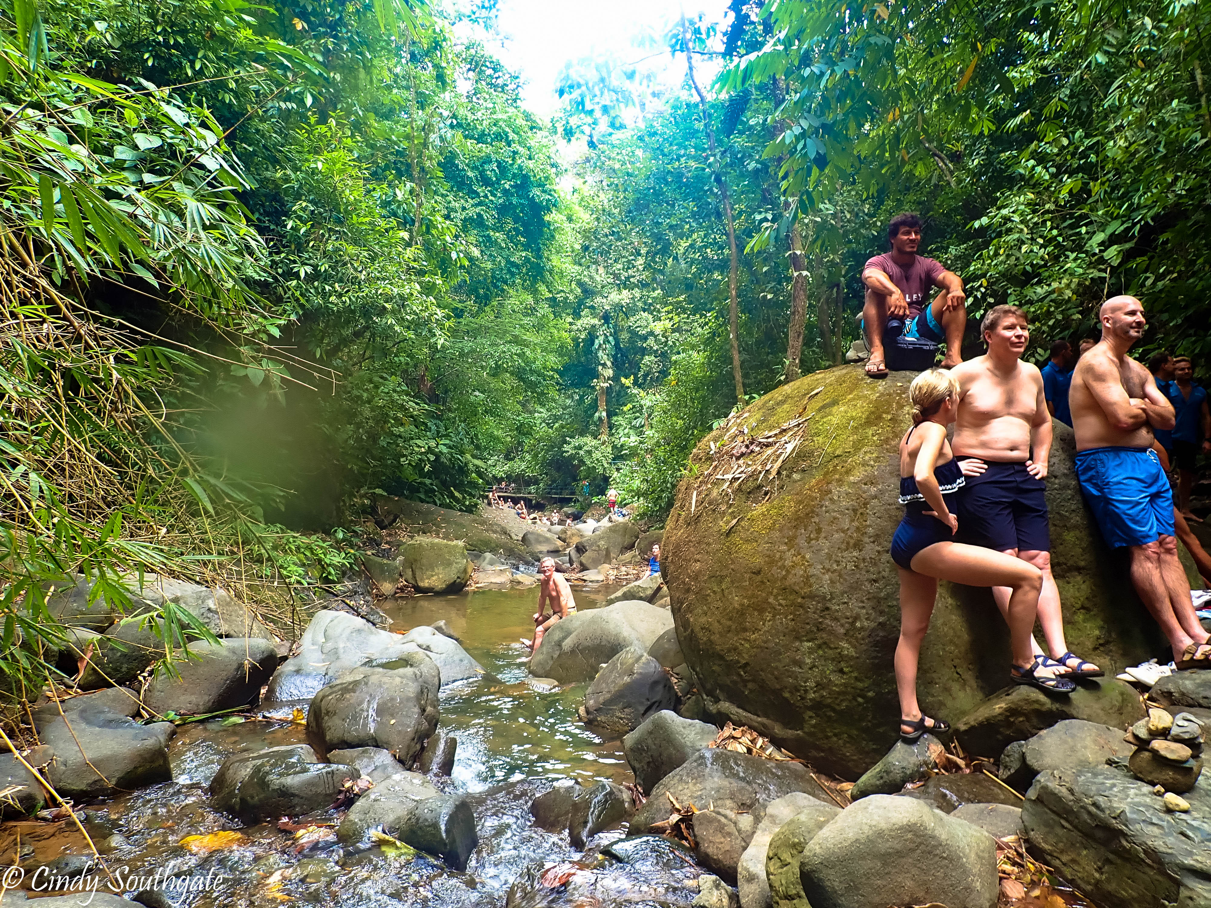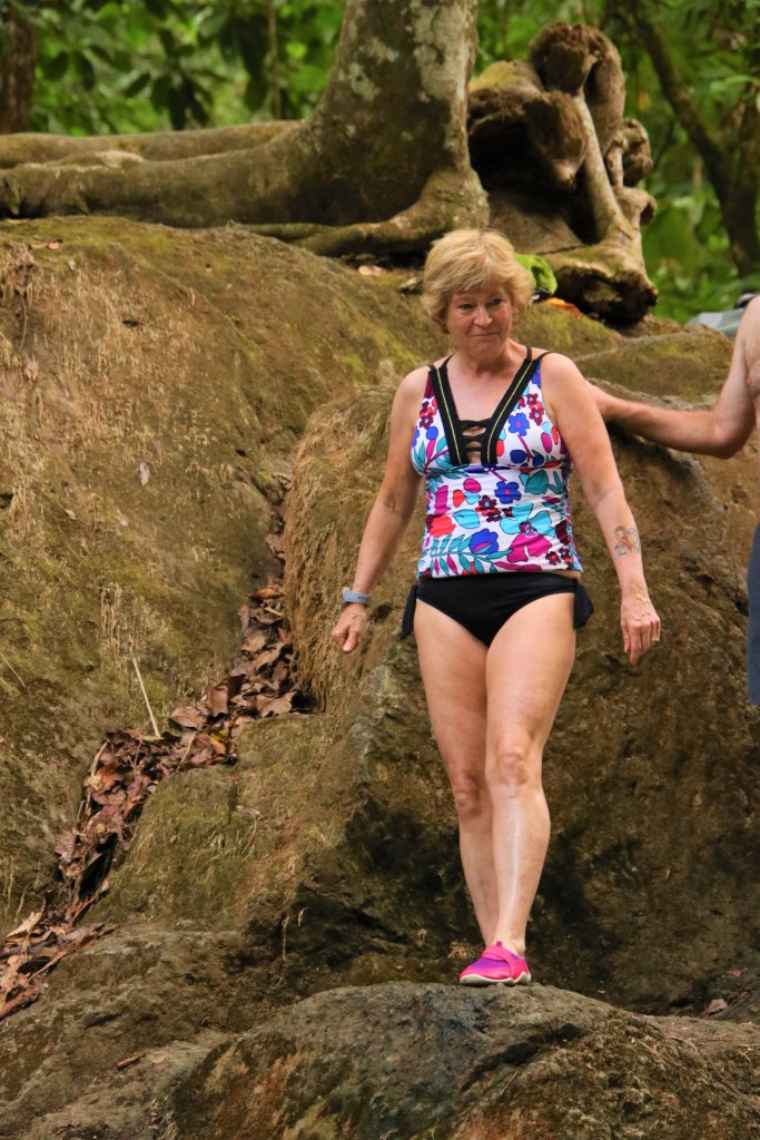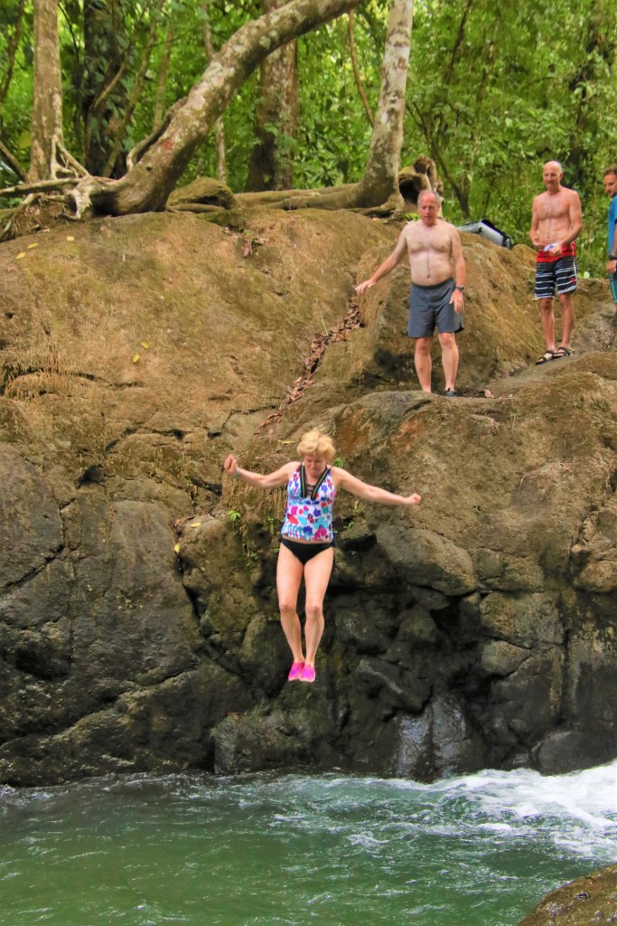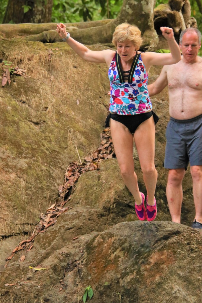The next stop had a bigger jump – about 5 meters. There was a wooden path and stairs leading to the area we would jump from. On my first jump I had a lot of water rush into my sinuses so I tried plugging my nose for the second jump. I hit the water with such force that it knocked my hand away from my nose, so that didn’t work. On our way out we had the option of jumping a third and forth time and we did. Before getting back in the bus we had a nice snack of fresh pineapple and watermelon.