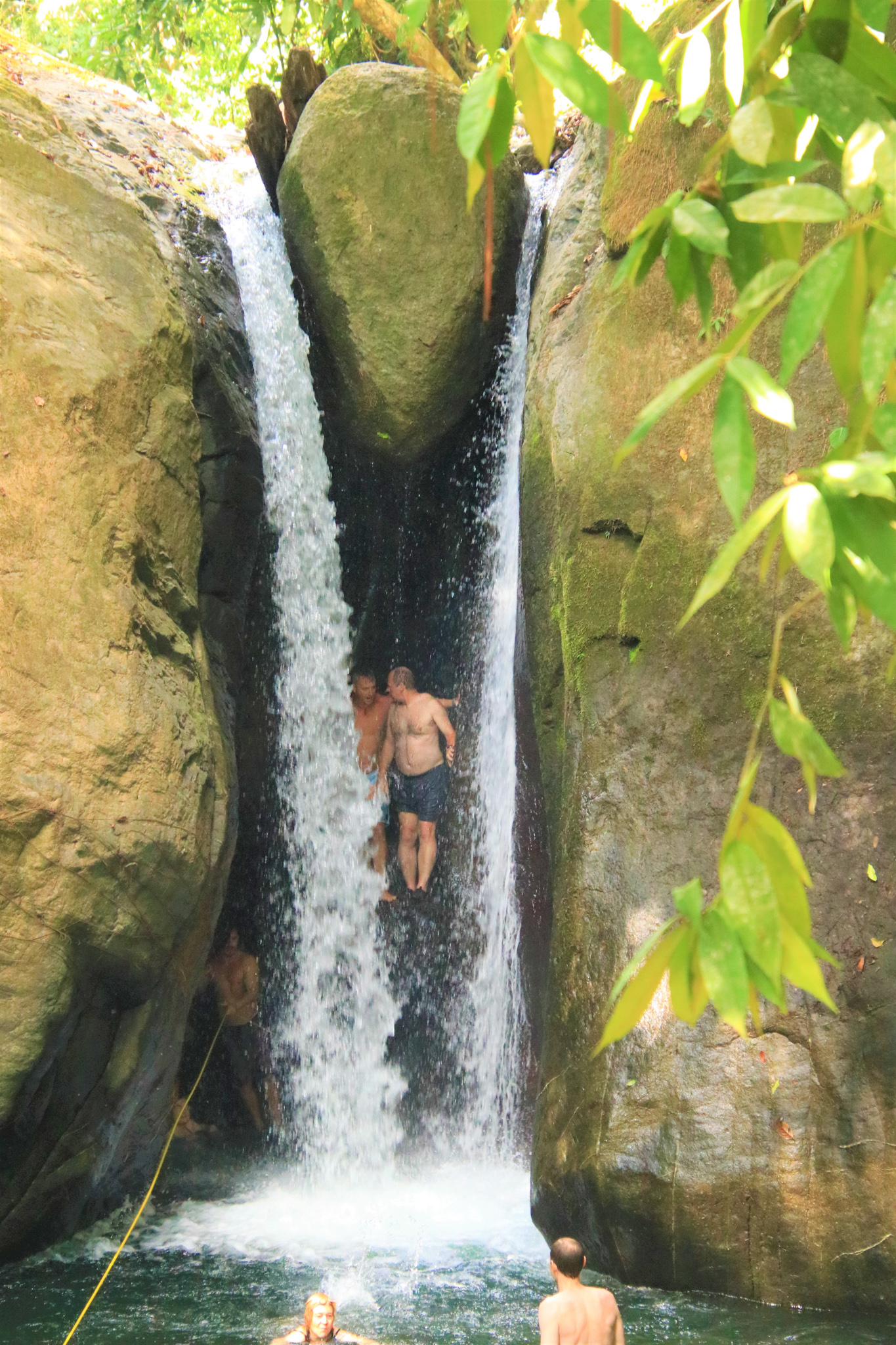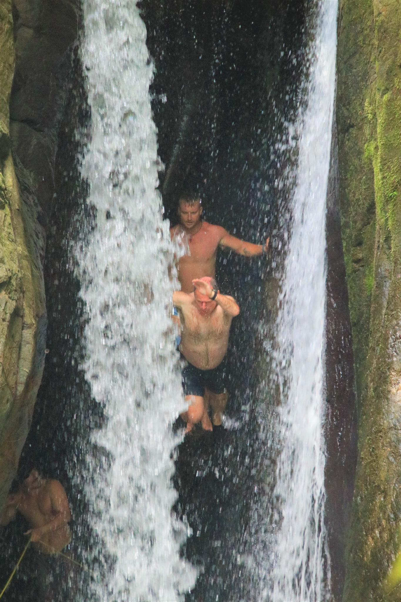 Our final waterfall stop was a smaller but different kind of jump. First we were told to lie on our back with our feet towards the waterfall opening while holding a rope they had put in place. Then we had to pull ourselves against the current until we were behind the waterfall. Once there, two guides helped us crawl up onto a large rock. From there we had to leap forward through the waterfall.