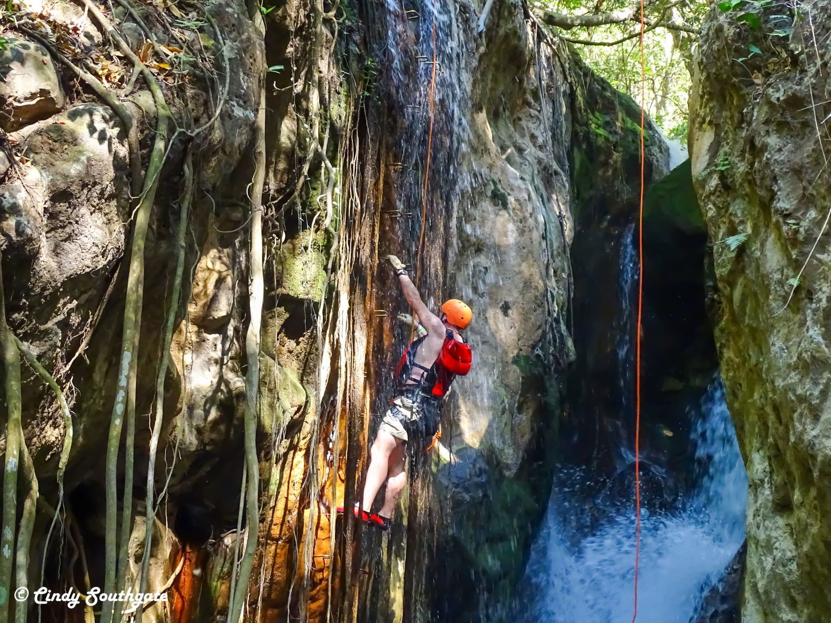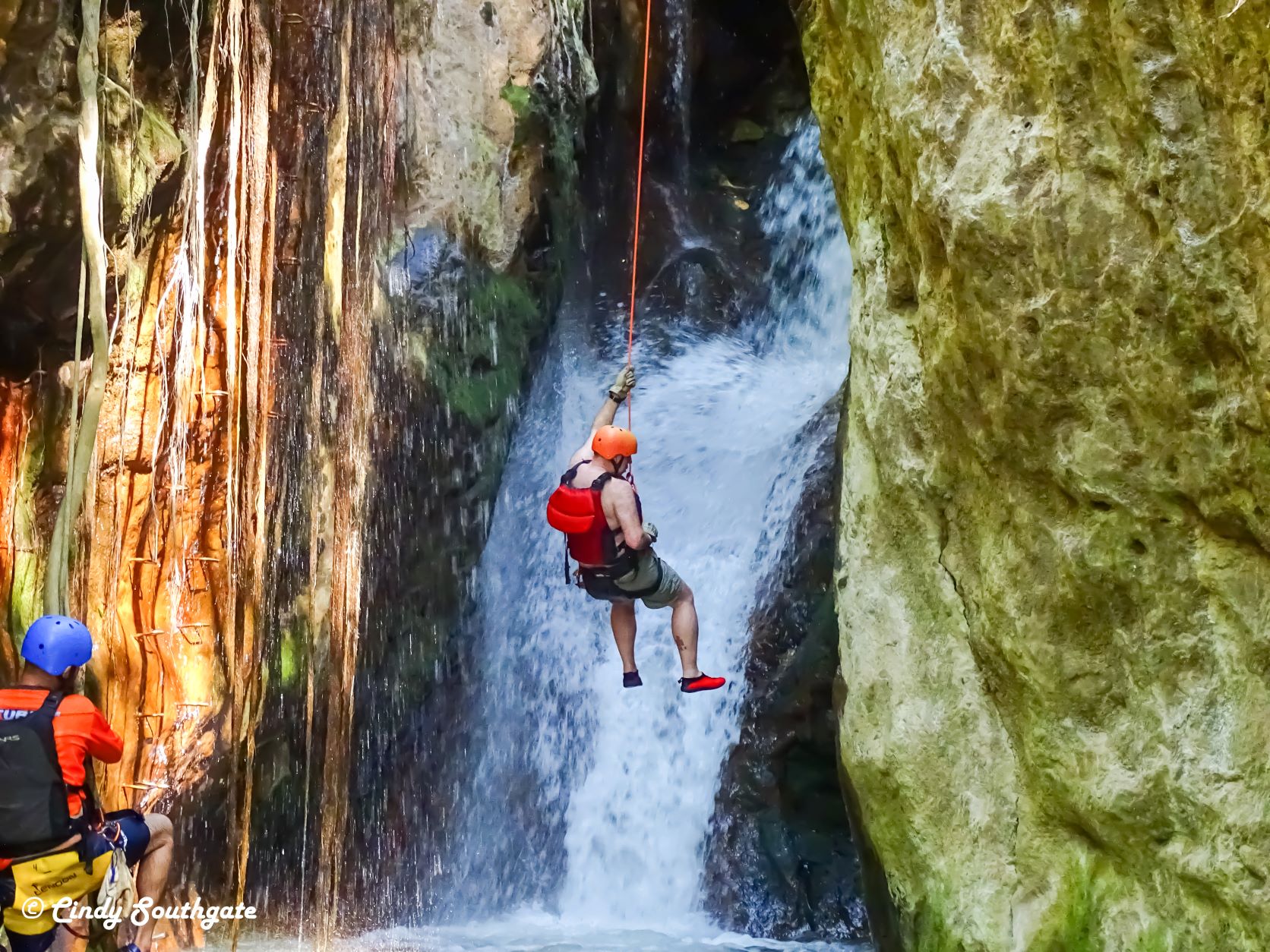 After the second rappel we stayed in the river and headed toward the bigger waterfall. We climbed out onto a platform and rappelled down a rock wall beside Victoria falls.