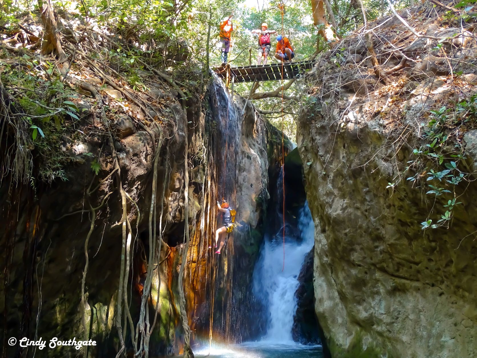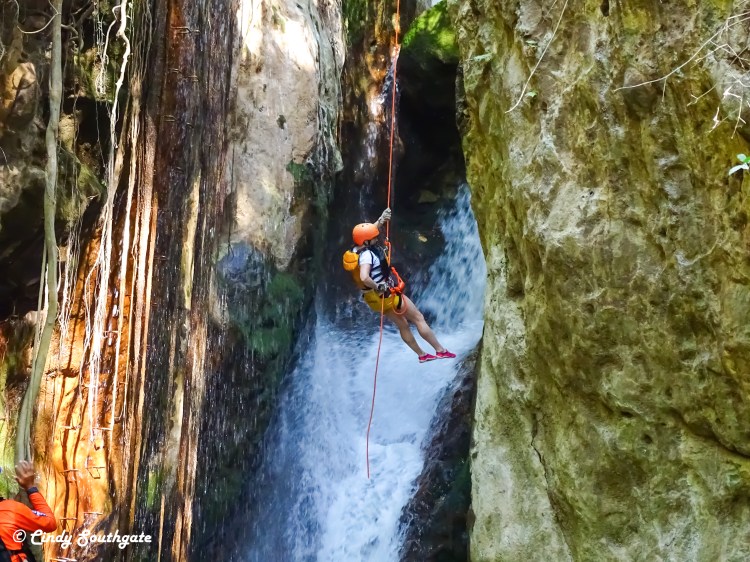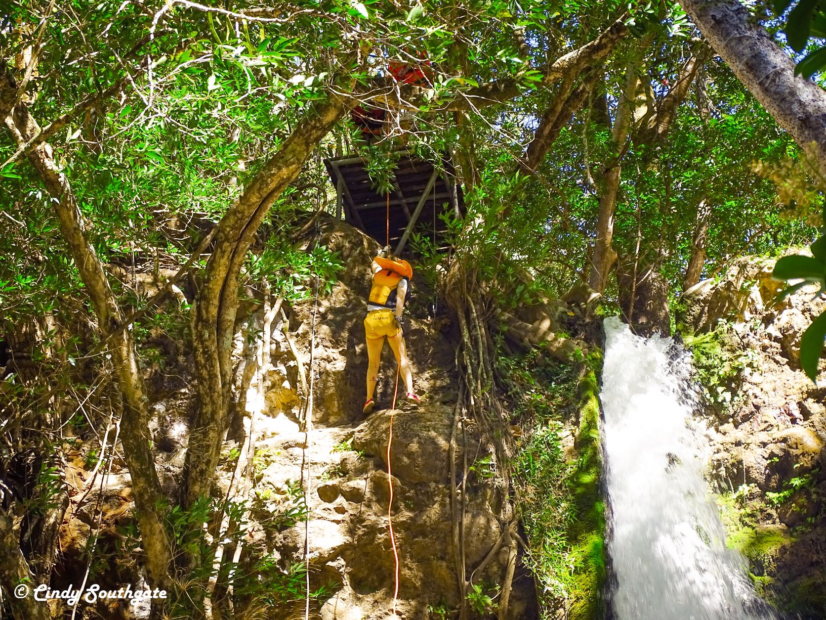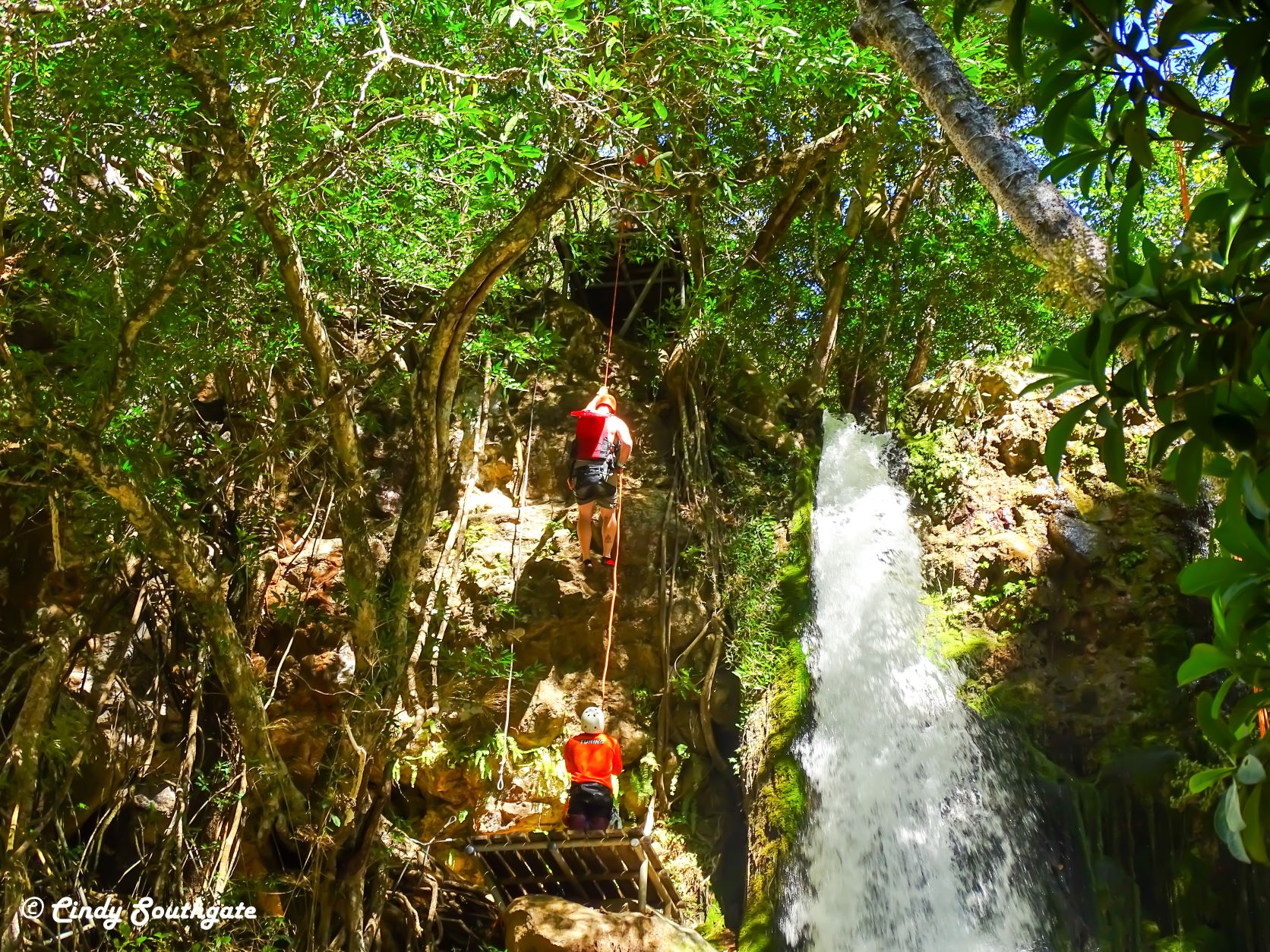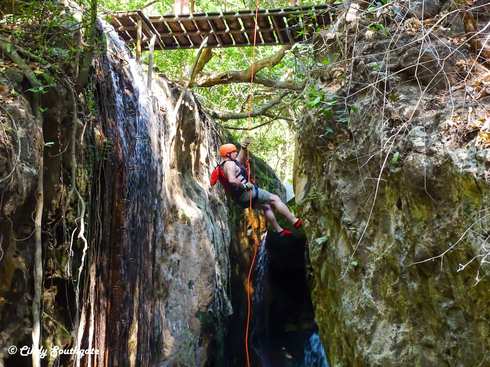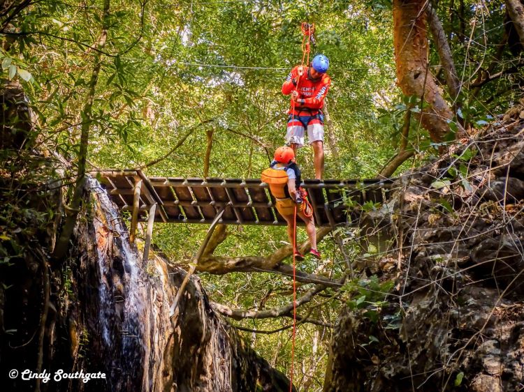 We were fitted with our rappelling gear and headed down the trail to a small wooden bridge over a narrow river. I am a bit afraid of heights but mostly when I am standing on something that I might fall of off. I made Mike go first!