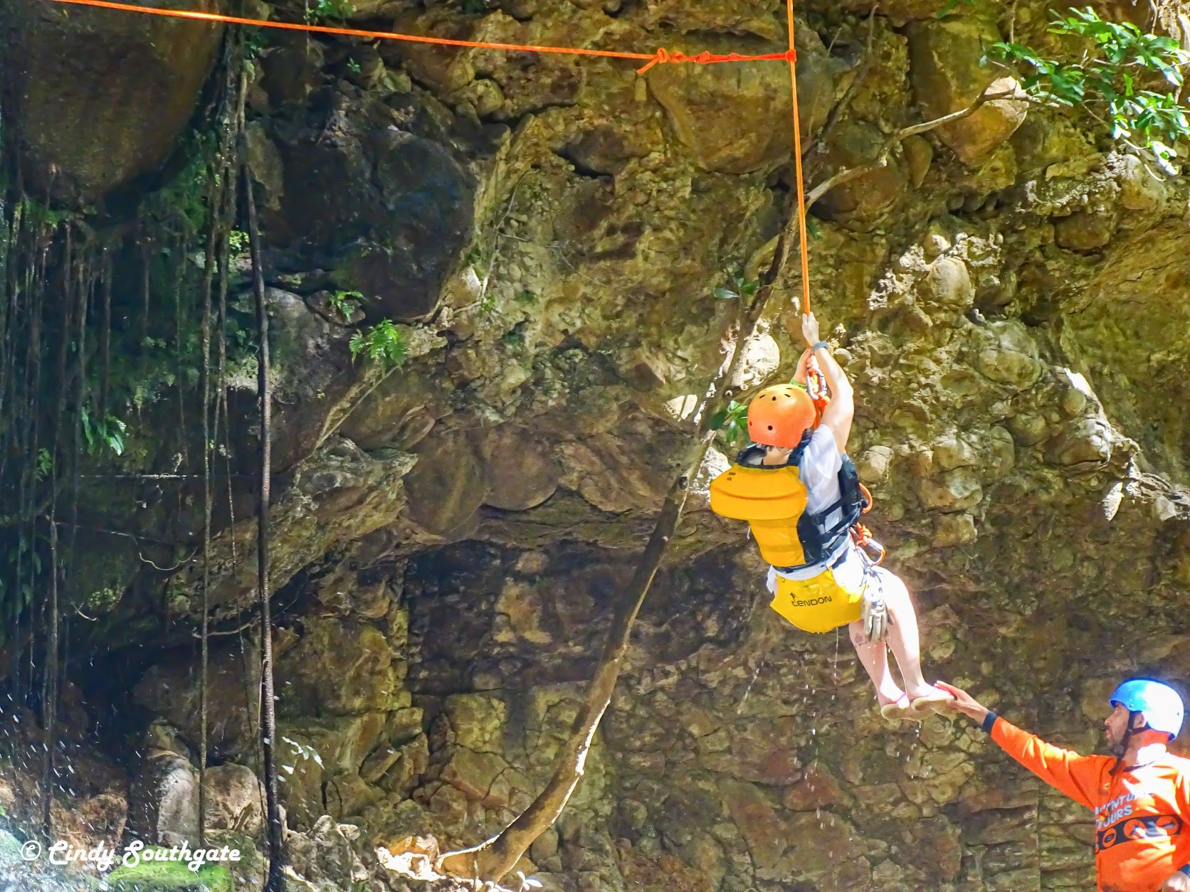 Once we were down on the second platform we got to swing across the river and back into the falls. There was a guide holding one end of our rope controlling where we went. When we had had enough, they caught us on the other side of the river.