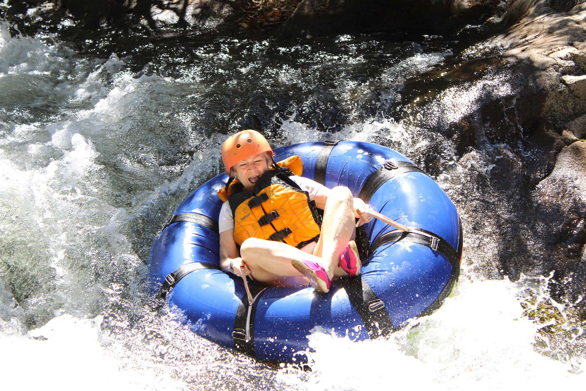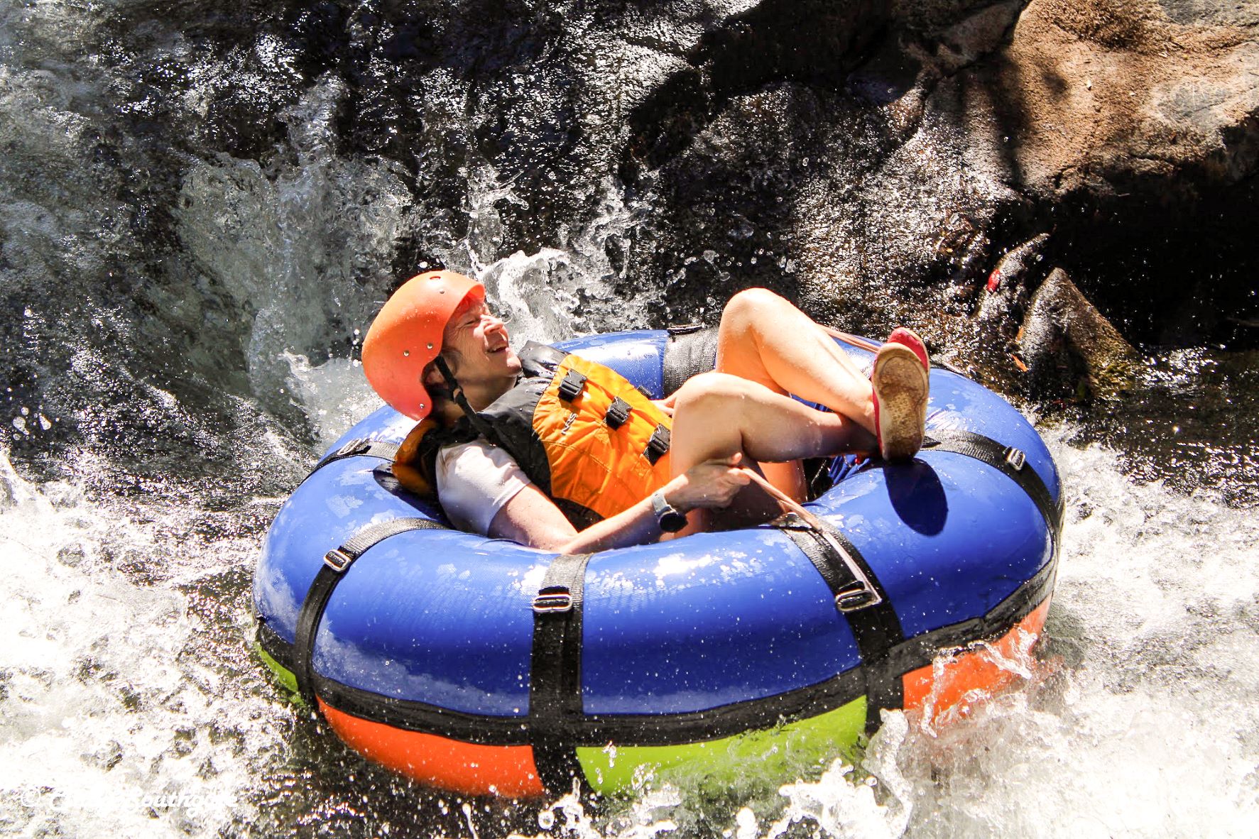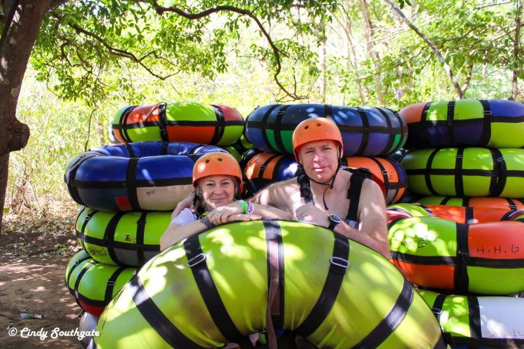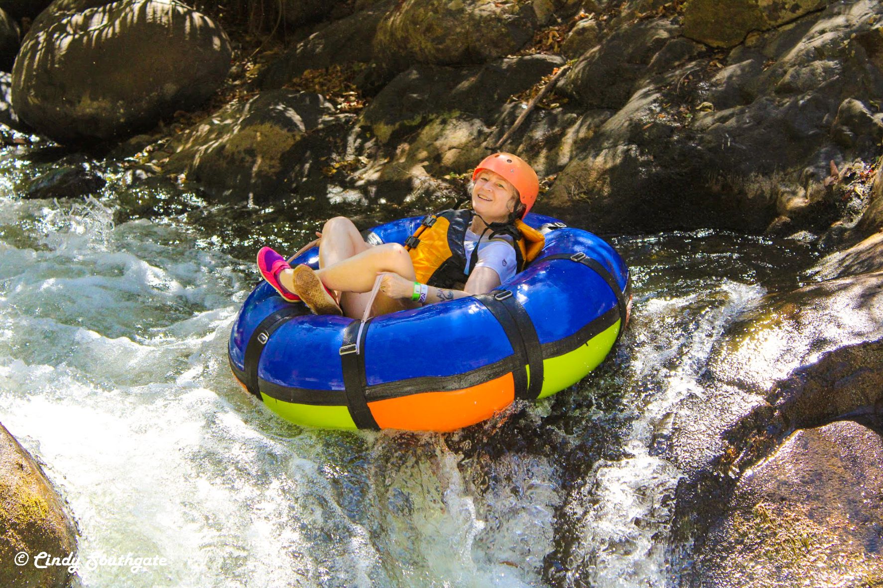 Next up was river tubing. We walked up the trail to the top of the waterfalls and waited for the rest of the group to join us. There were approximately 45 people in the group, mostly young people in their 20’s and 30’s. We dropped off our rappelling gear, chose an inner tube and headed back down the trail to the base of the waterfall where the tubing tour started.