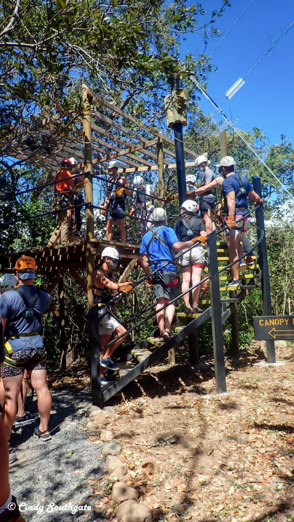 We had to wear our masks for this part of the tour. We would be nose to nose with the guides when they hooked us onto the zip line and would also be very close to the other tour participants as we would have a very small platform to stand on in between the runs. There were 9 lines and the first line was accessed by a small set of stairs. After that it would be a series of platforms.