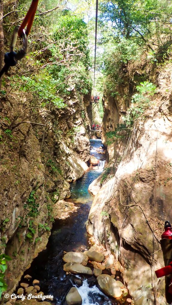 One of the platforms required us to climb a set of hanging stairs. It was very scary so I did it quickly. The scenery on this tour was amazing- for part of it we were in a gorge. At one point we had the option of rappelling down to a platform above the river and then climbing back up. Since we had already done that earlier in the morning we chose not to. We were also a bit tired from all the intense activities.