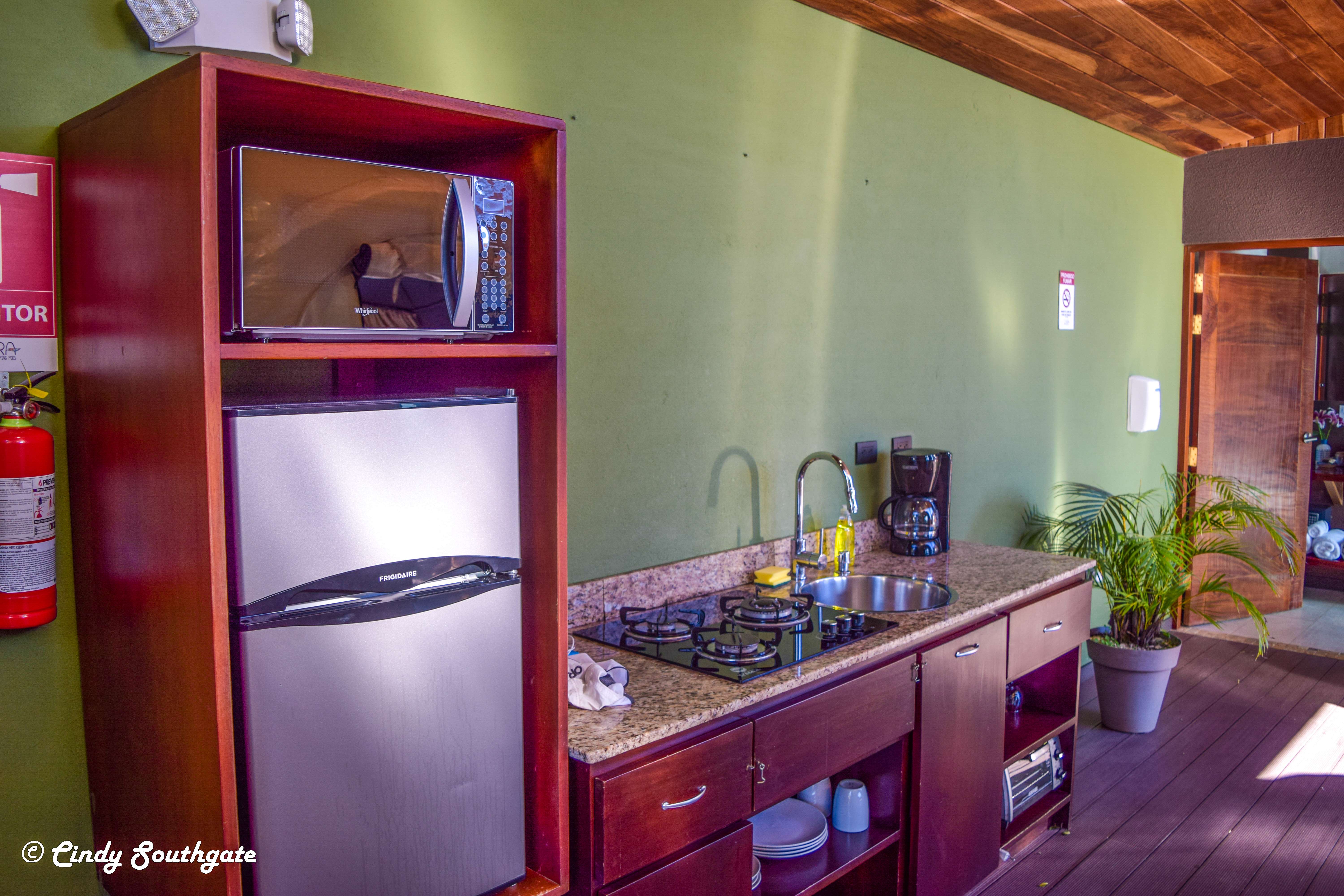 The tent and deck were built on a steep hillside and are almost 100% private. The deck was enormous. Upon entering the platform, the tent was on the right. To the left was a kitchen complete with a sink, stove top and fridge stocked with eggs, juice, soft drinks and beer. There was a roof over the kitchen area that extended to the bathroom.