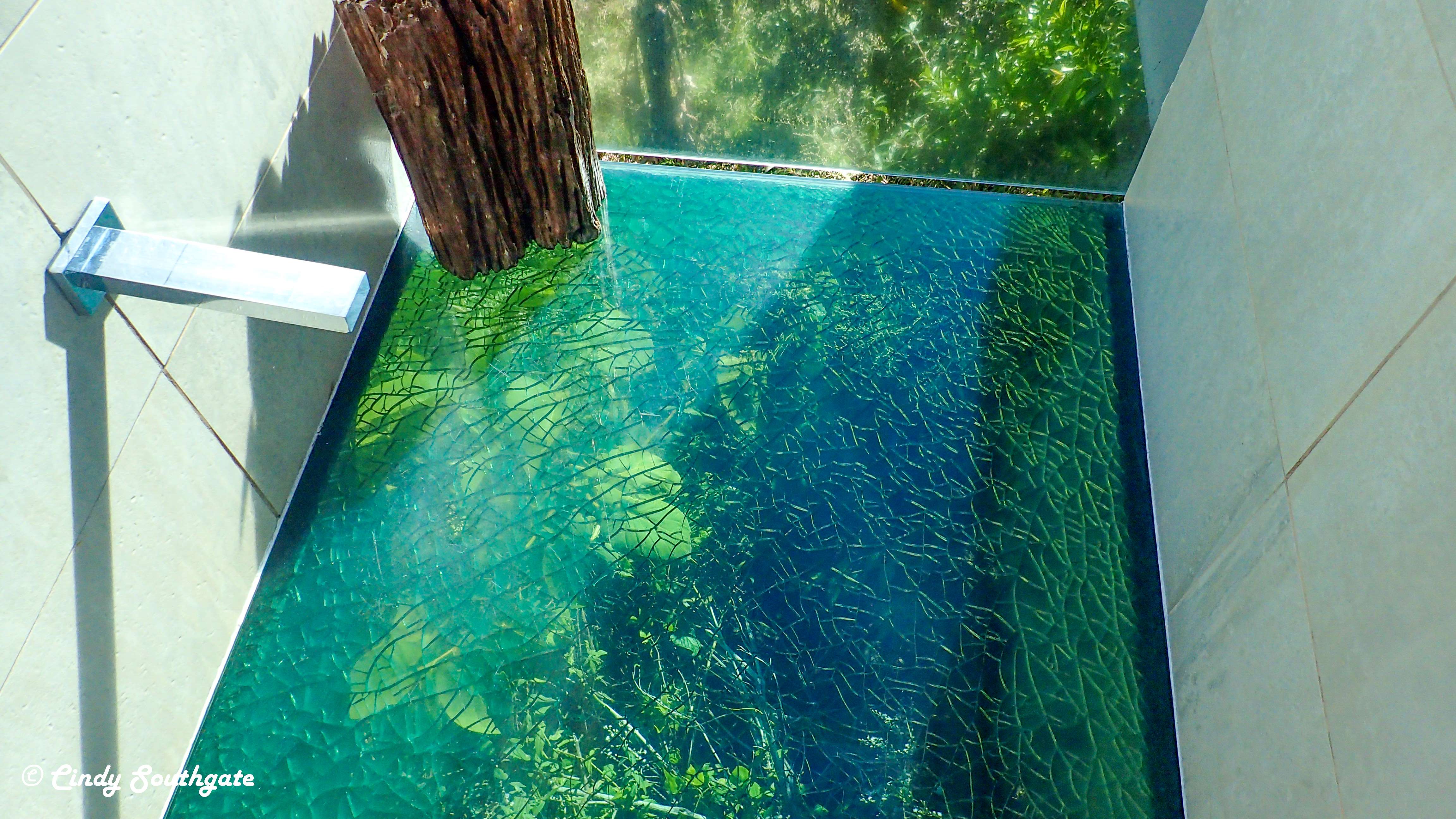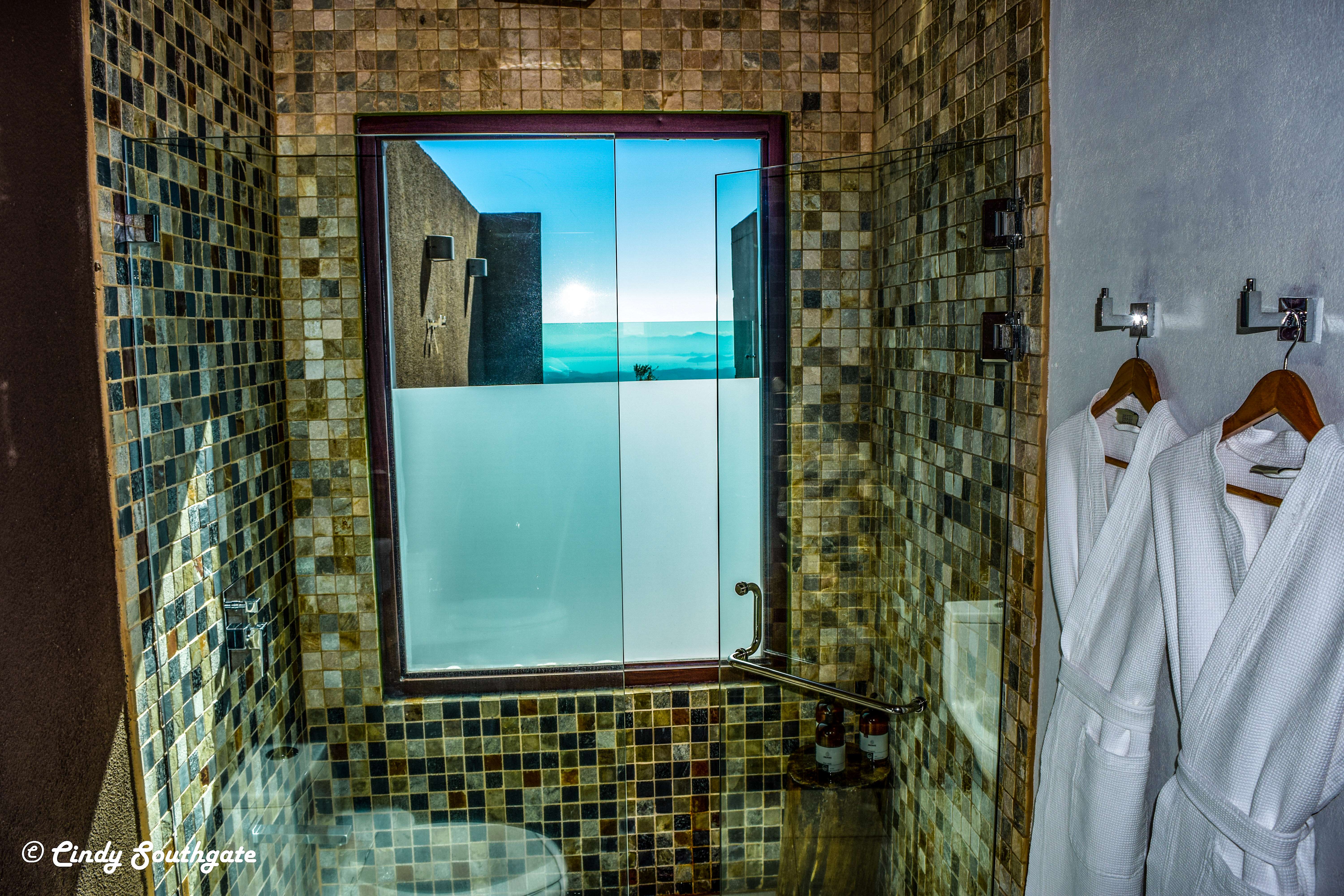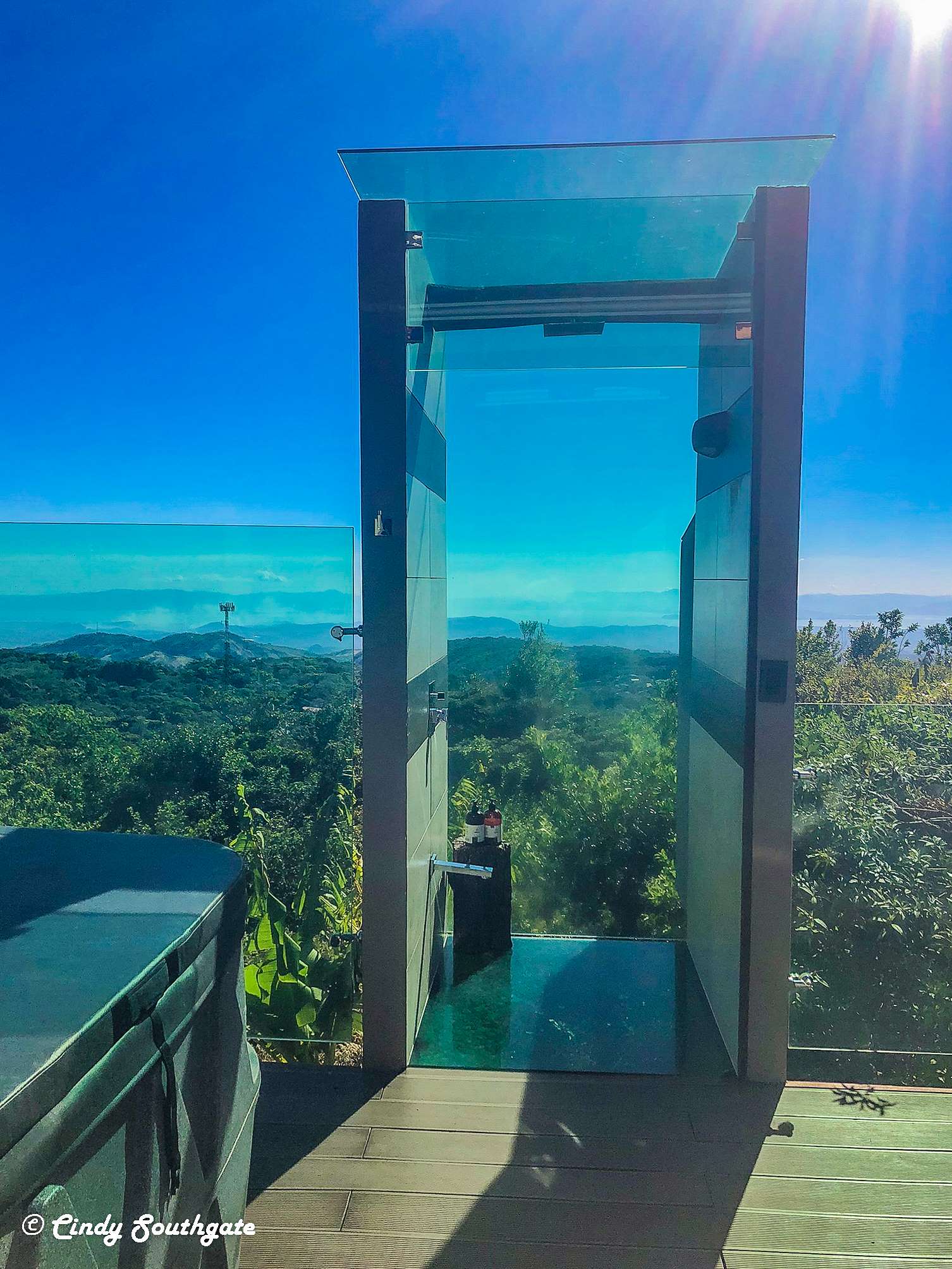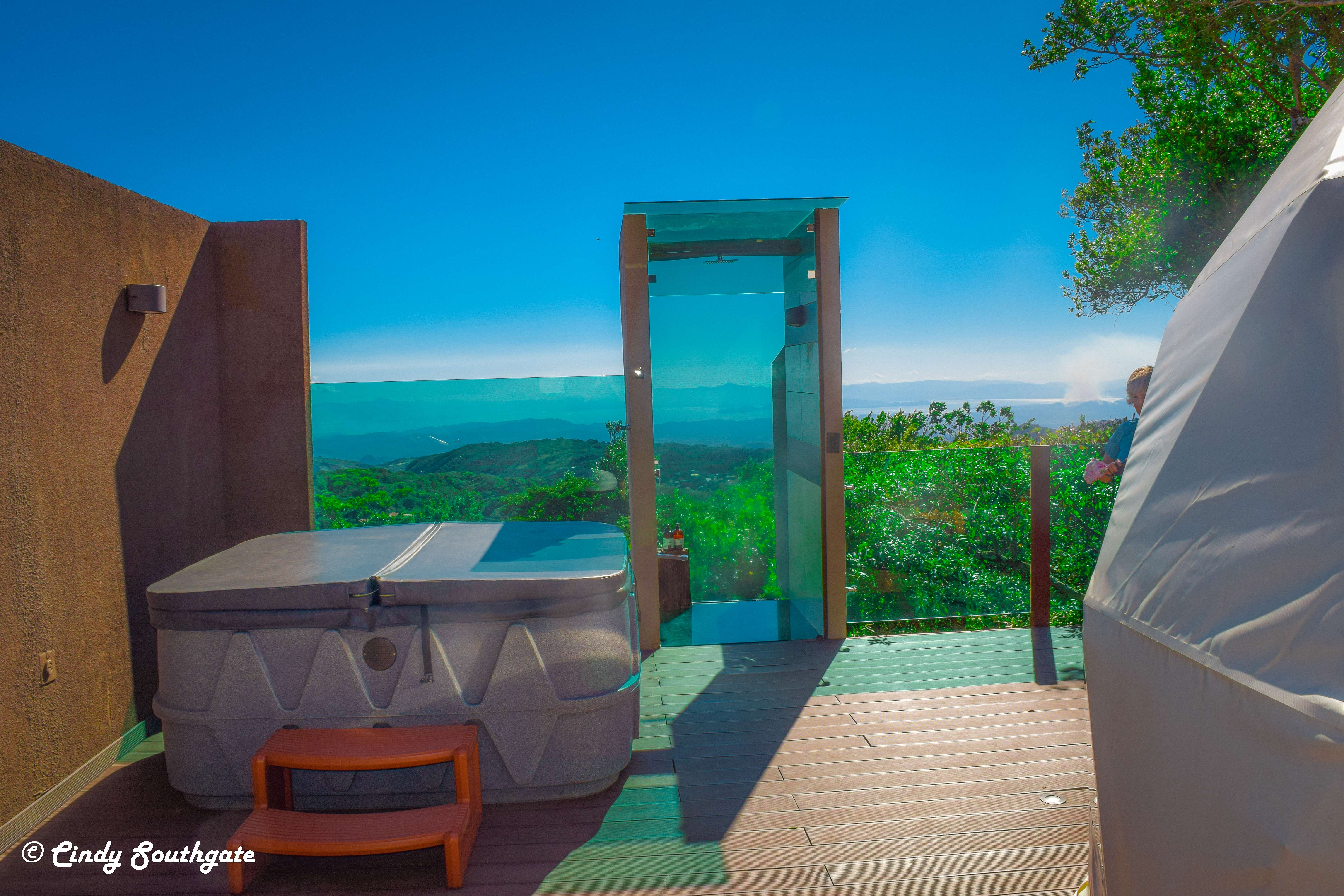 The uncovered side of the deck included a BBQ, hot tub, seating area and a unique shower with a glass wall and floor that extended out over the hill and was completely private.