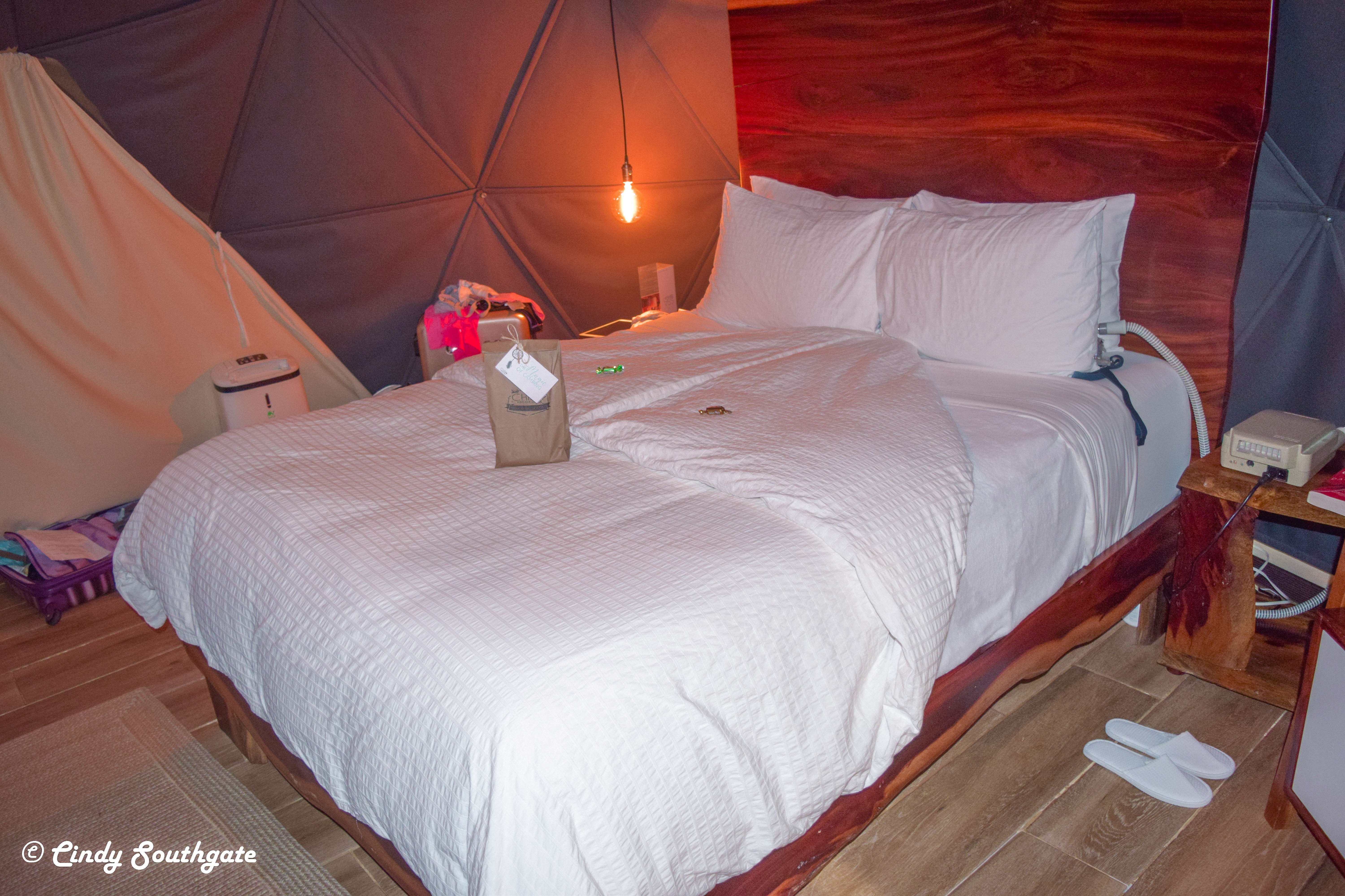 The inside of the tent was nicely set up with a double bed and dresser. There were curtains that could be closed although no one can see in. There was also a basket of food on the dresser containing snacks and pieces of fruit.