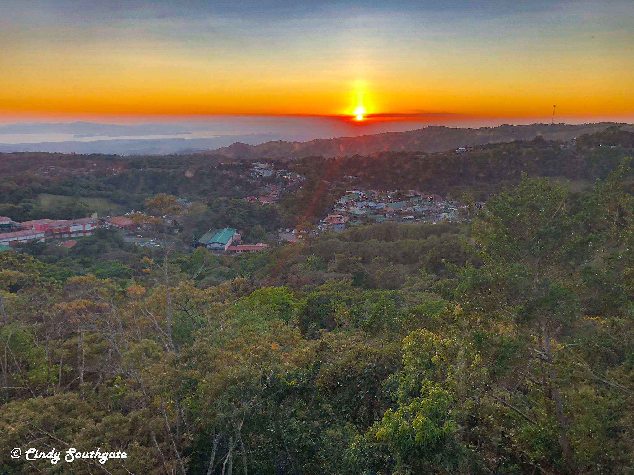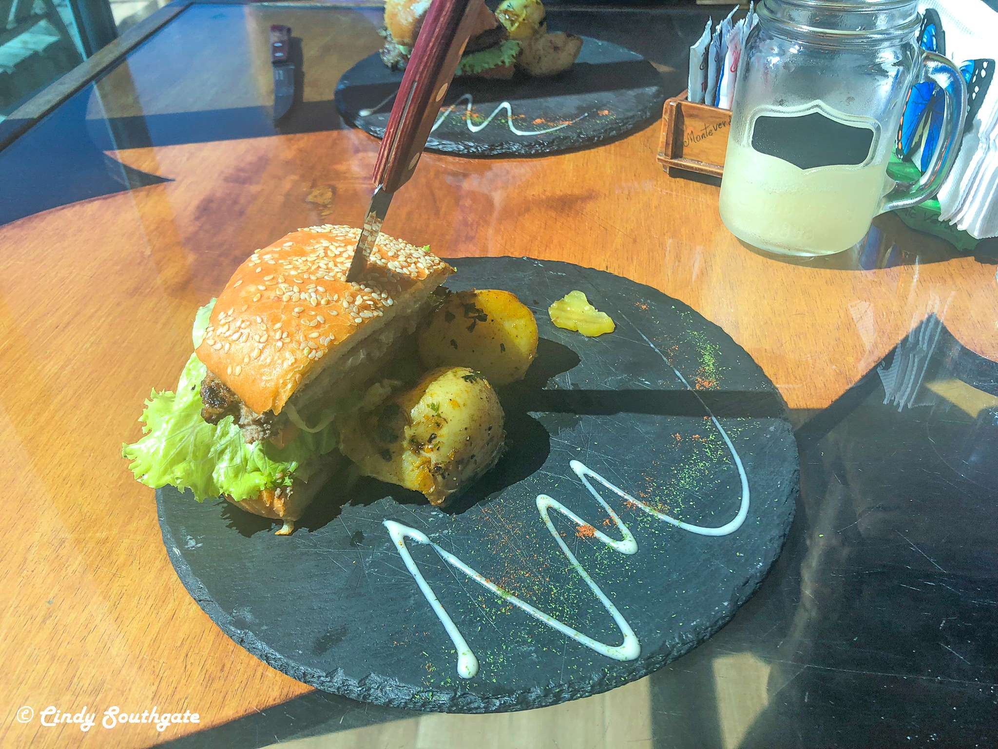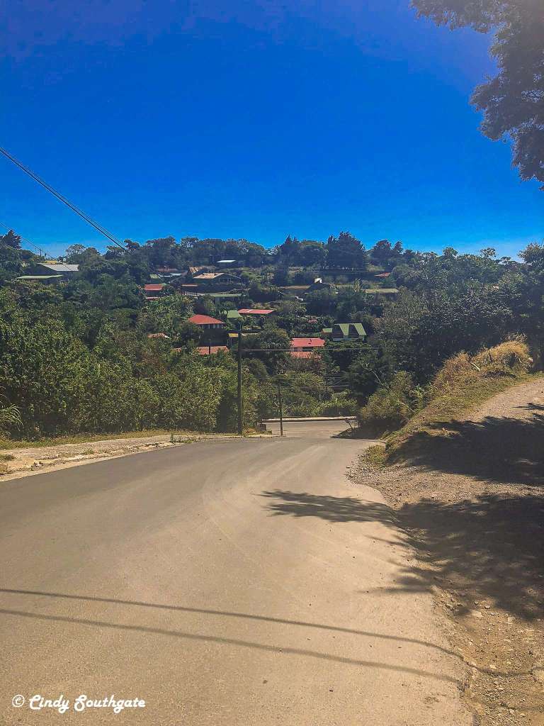 With no stops along the way, we arrived at our hotel before check-in time. We parked our car and wandered down the steep hill into town. We found a cute restaurant called Morpho’s, named after a beautiful, large blue butterfly found in Costa Rica. It was on a hill and provided a view of part of town and was nicely decorated inside. Unfortunately the service was bad. We were seated but waited for 30 minutes without even a menu. Mike went over to complain and after that everything was fine. We would have left but we were very hungry. We shared a hamburger which worked out well as the serving was rather large.