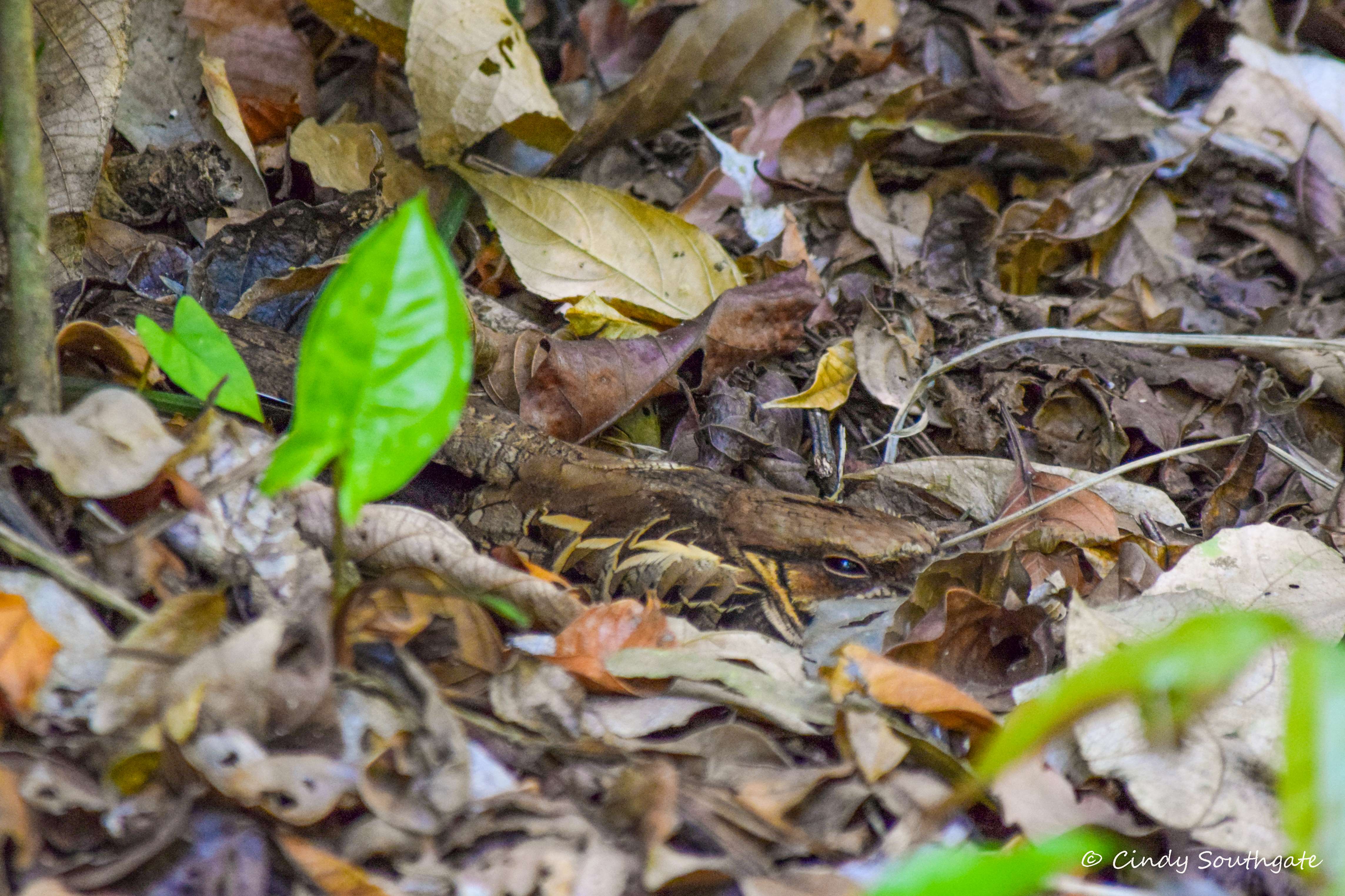 The Common Pauraque is a very hard bird to find unless you know where to look for it. They are often found on the sloth trail in this park so the guides know where to look. I had a hard time seeing it in the leaves until I spotted its eye. They are ground nesters.