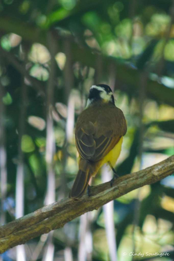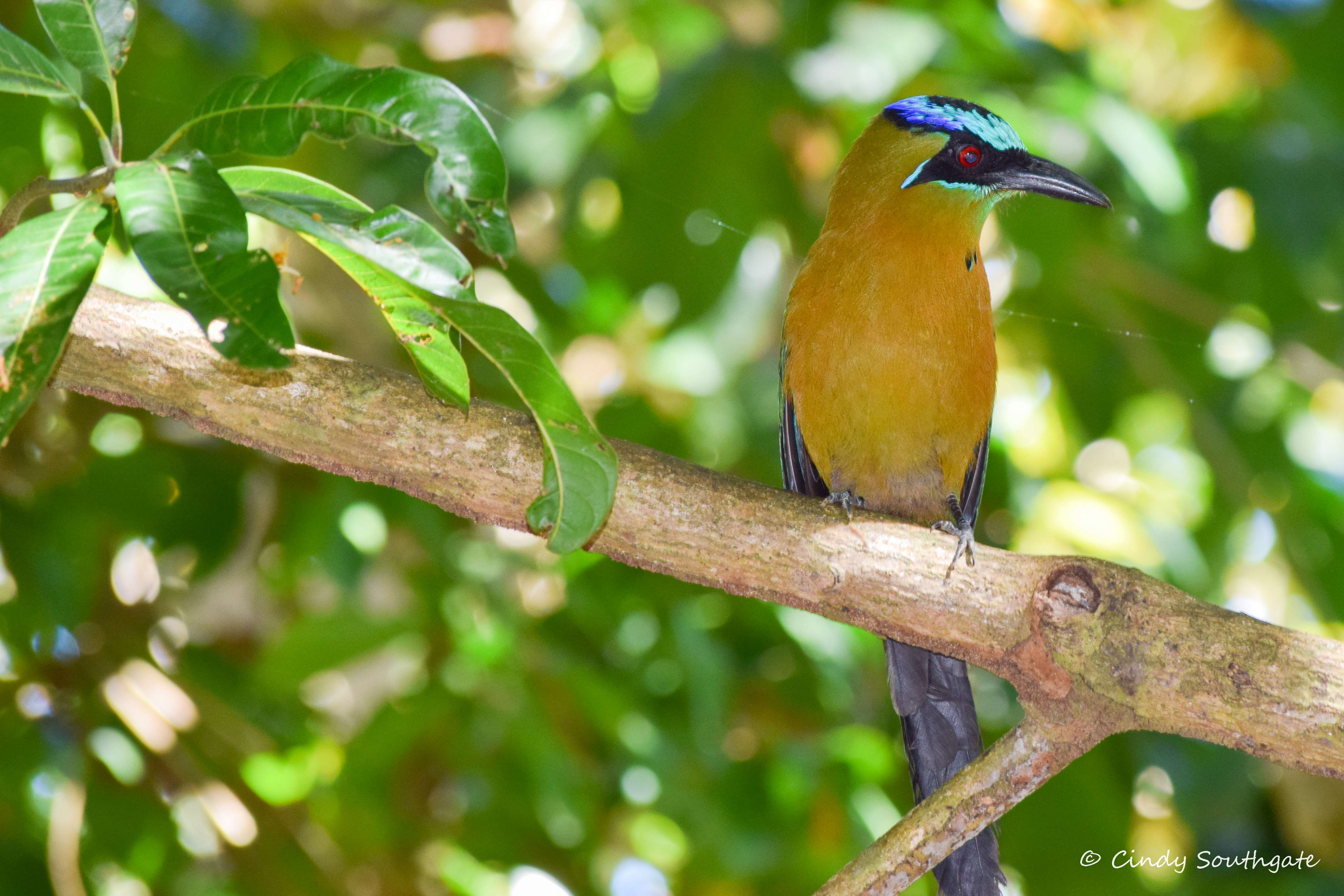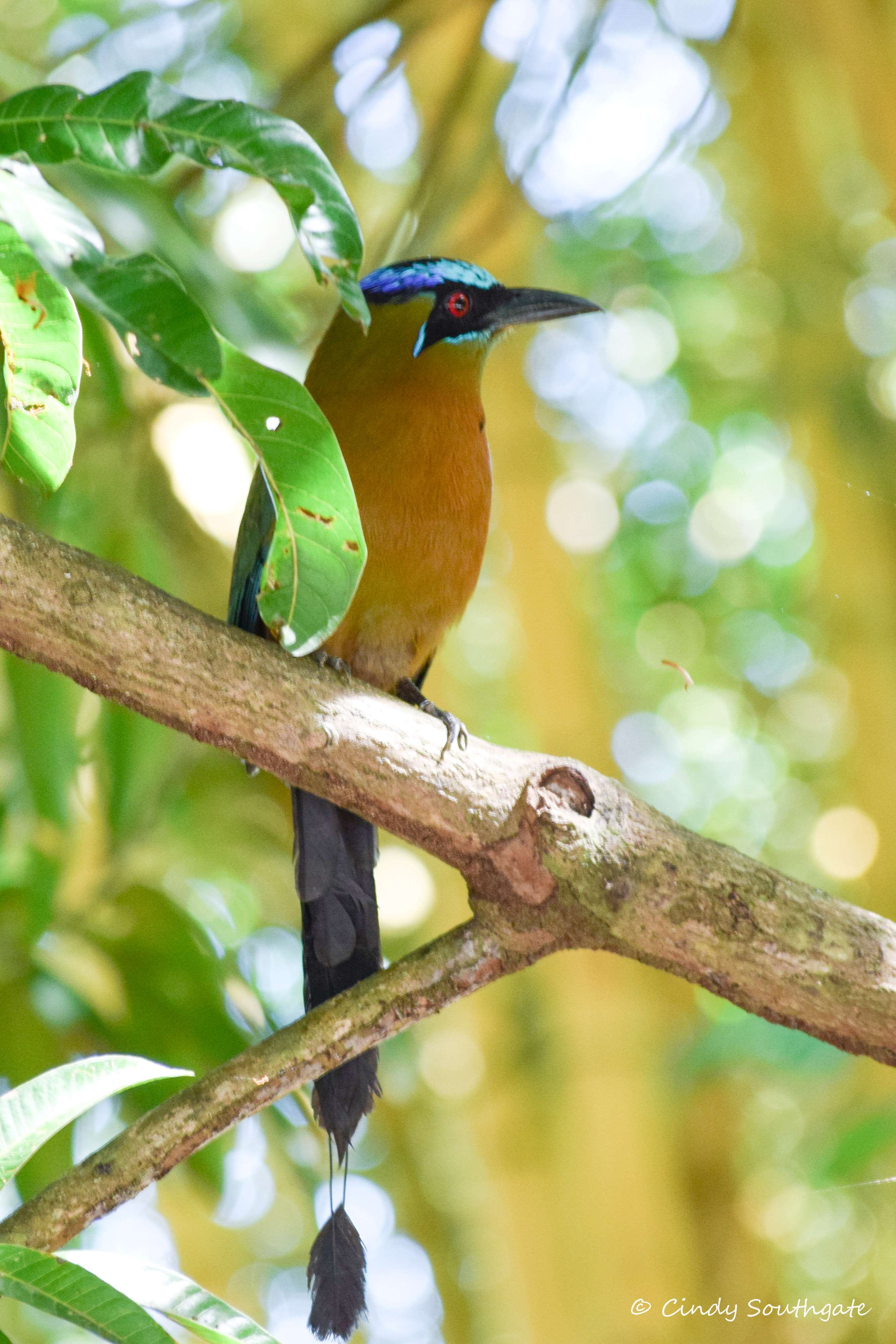 We saw several Kiskadees during our trip. It is a fairly small bird at 23 centimetres in length and has a bright yellow front. We also found the bigger and more colourful Blue-crowned Motmot. It is 39 centimetres long and has very interesting tail feathers.