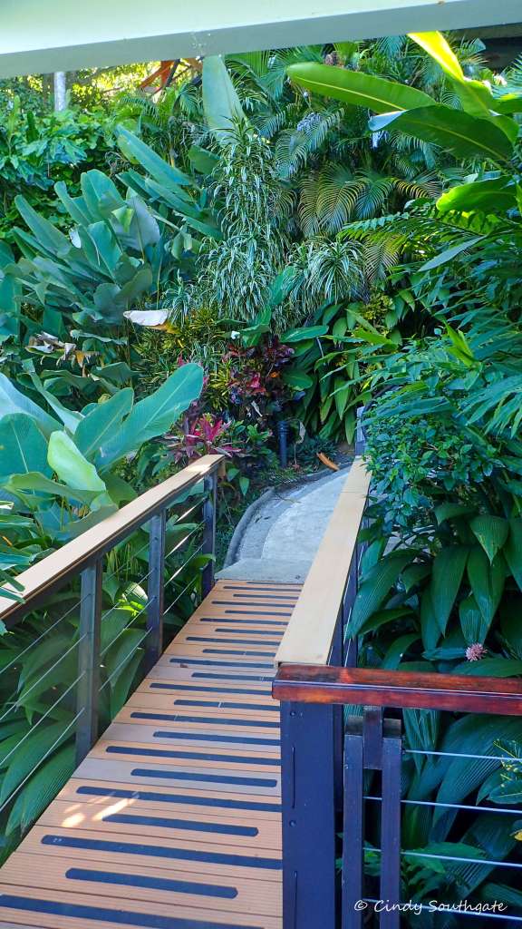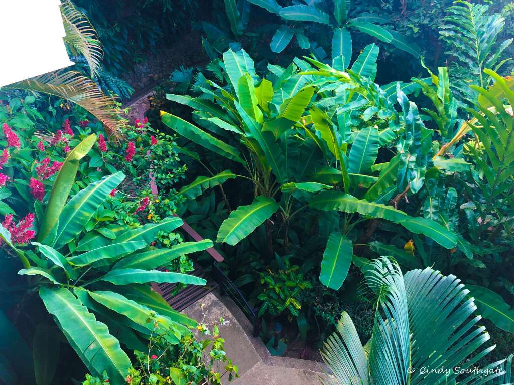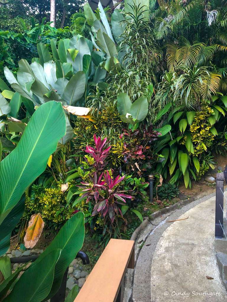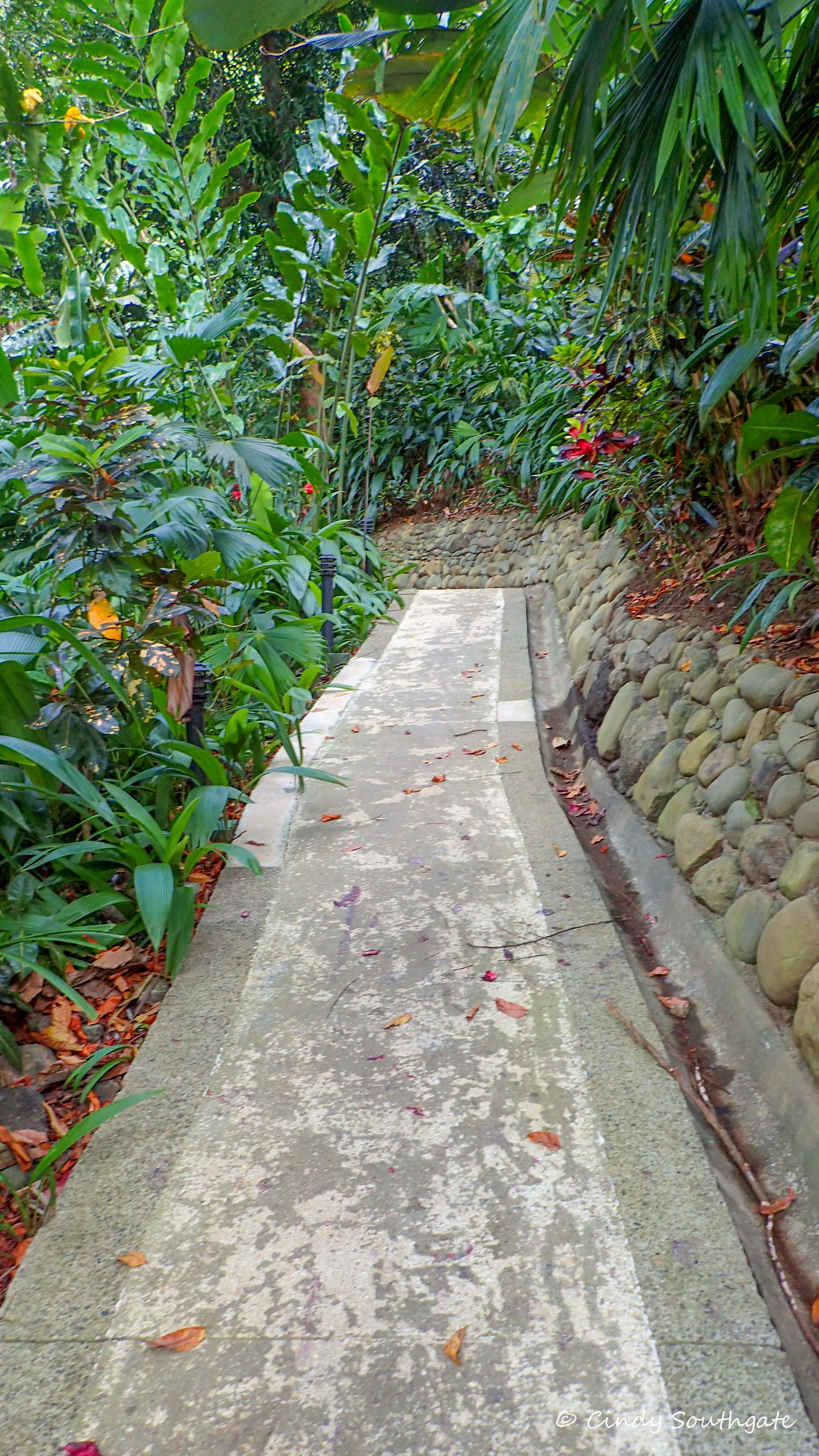 The following pictures show the view looking straight down from our balcony and the path leading off our balcony towards the restaurant. It is very beautiful and lush.