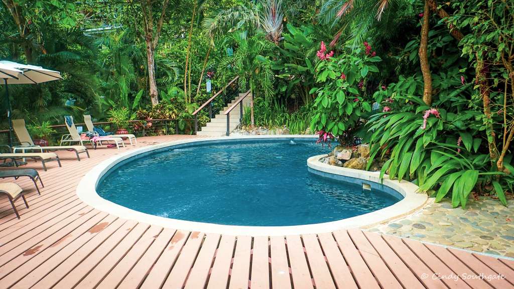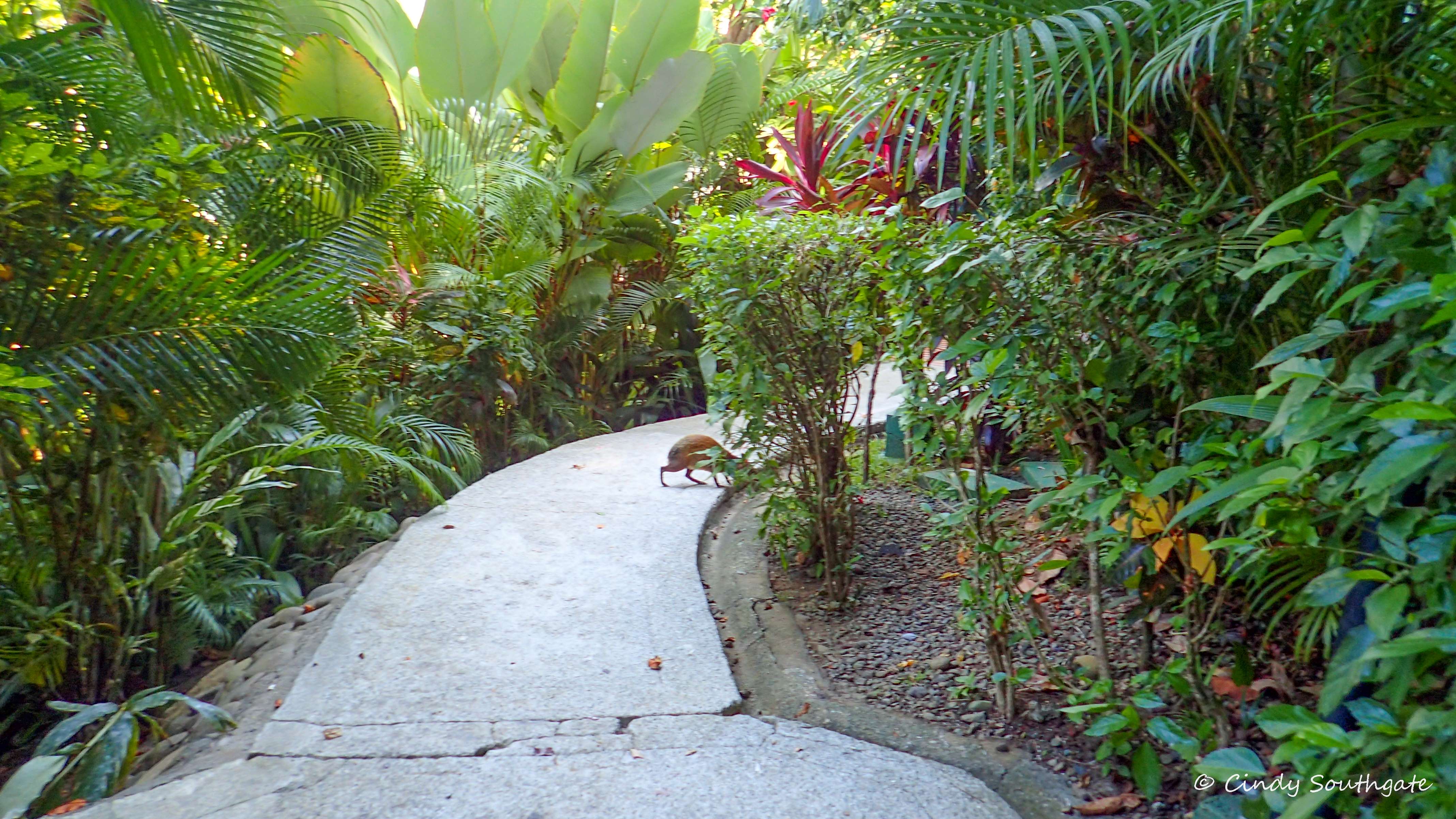 The pathways between the units have a lot of pretty vegetation surrounding them. This also adds some privacy. We quite often saw an Agouti when heading out. They are a fairly large rodent similar in size to a rabbit but they have tiny ears. Their young are very well developed when they are born and the mother takes them on a tour to choose their own den when they are one day old. It is only big enough for them so it protects them from predators. The Mom comes by to nurse them.