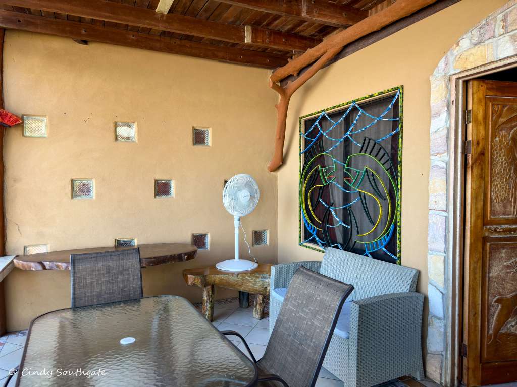 Our cabin had a queen sized bed, a bunk bed and also included an outdoor kitchen. It had air conditioning plus a fan over the bed. The bathroom was cute but a bit small without much room to put out toothbrushes etc. We liked the carved wood door entering the cabin as well as the one to the outdoor kitchen.