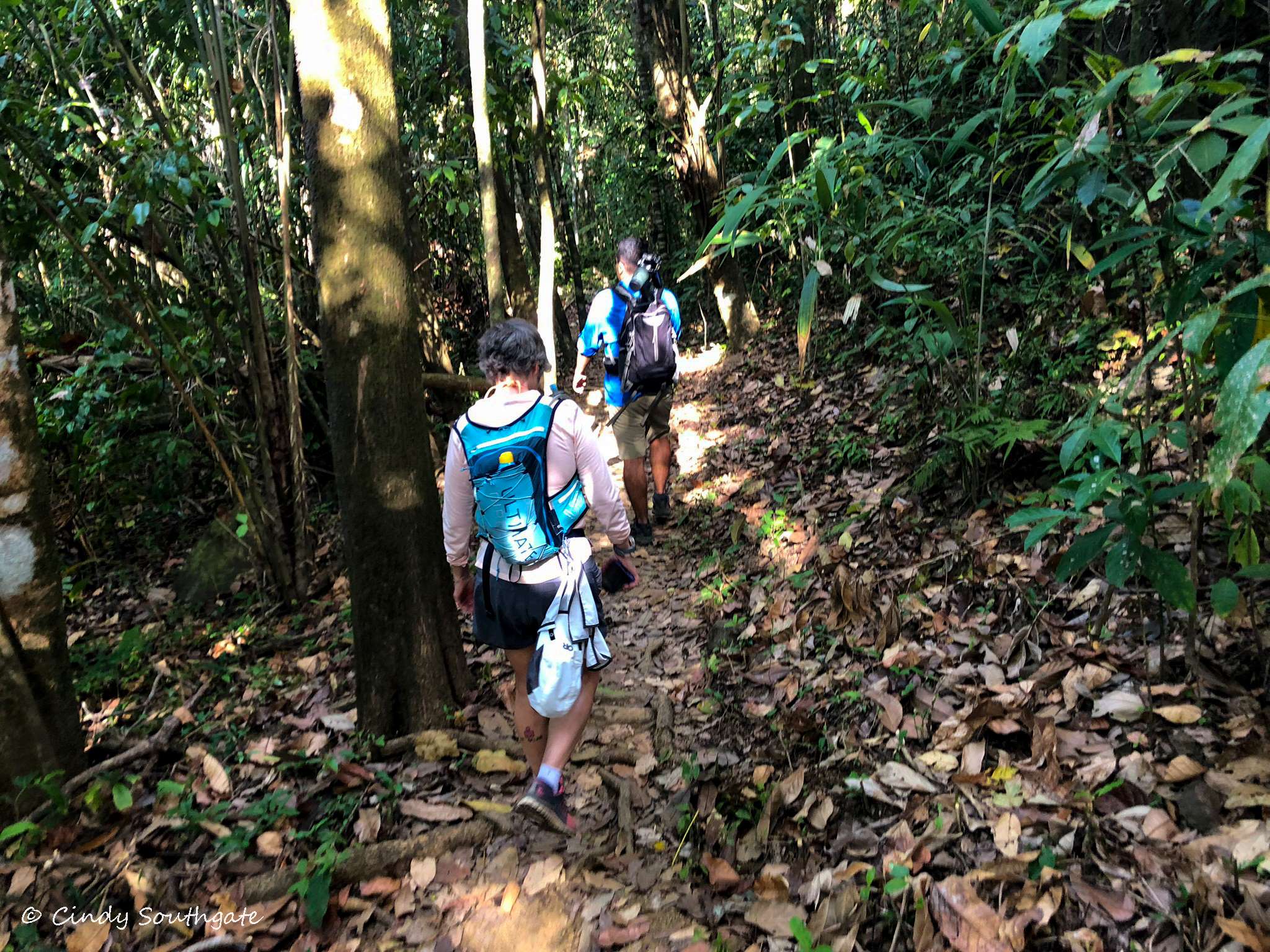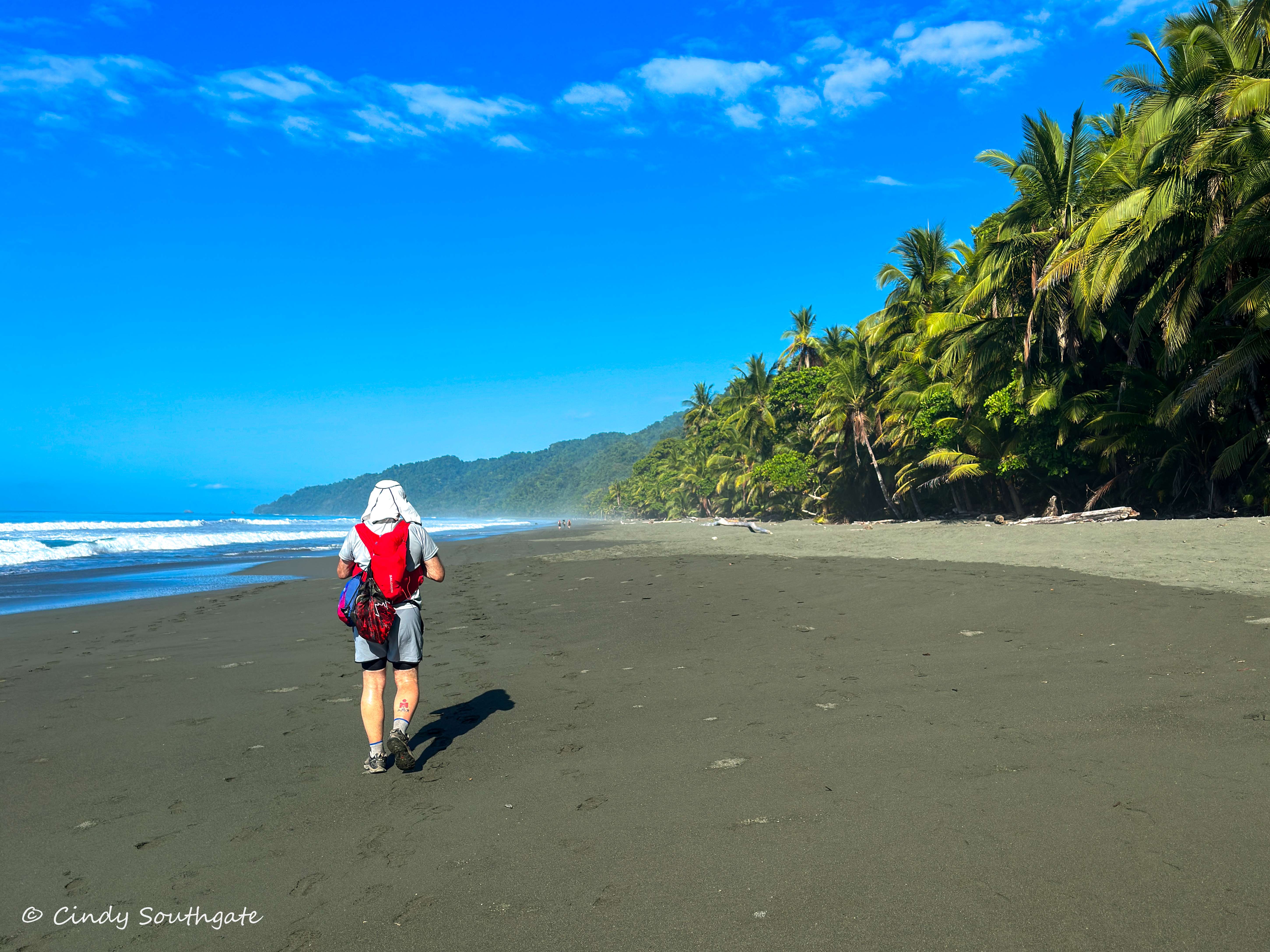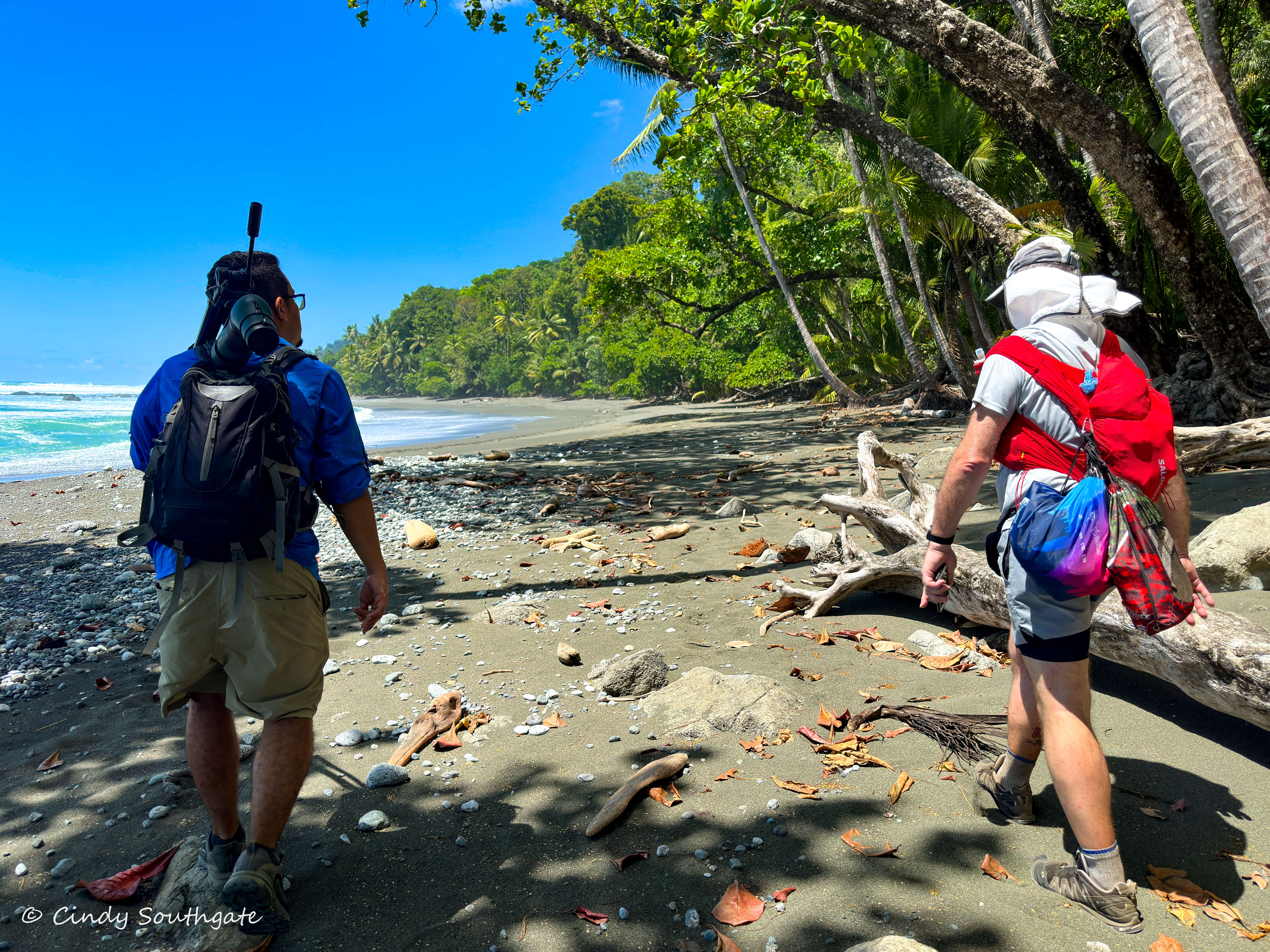 We started our hike by following the trail into the rainforest. Over the day we would alternate between forest trails and the beach. We carried sunscreen and lots of water to offset the hours in the sun and the humidity, which made our already heavy backpack much heavier.
