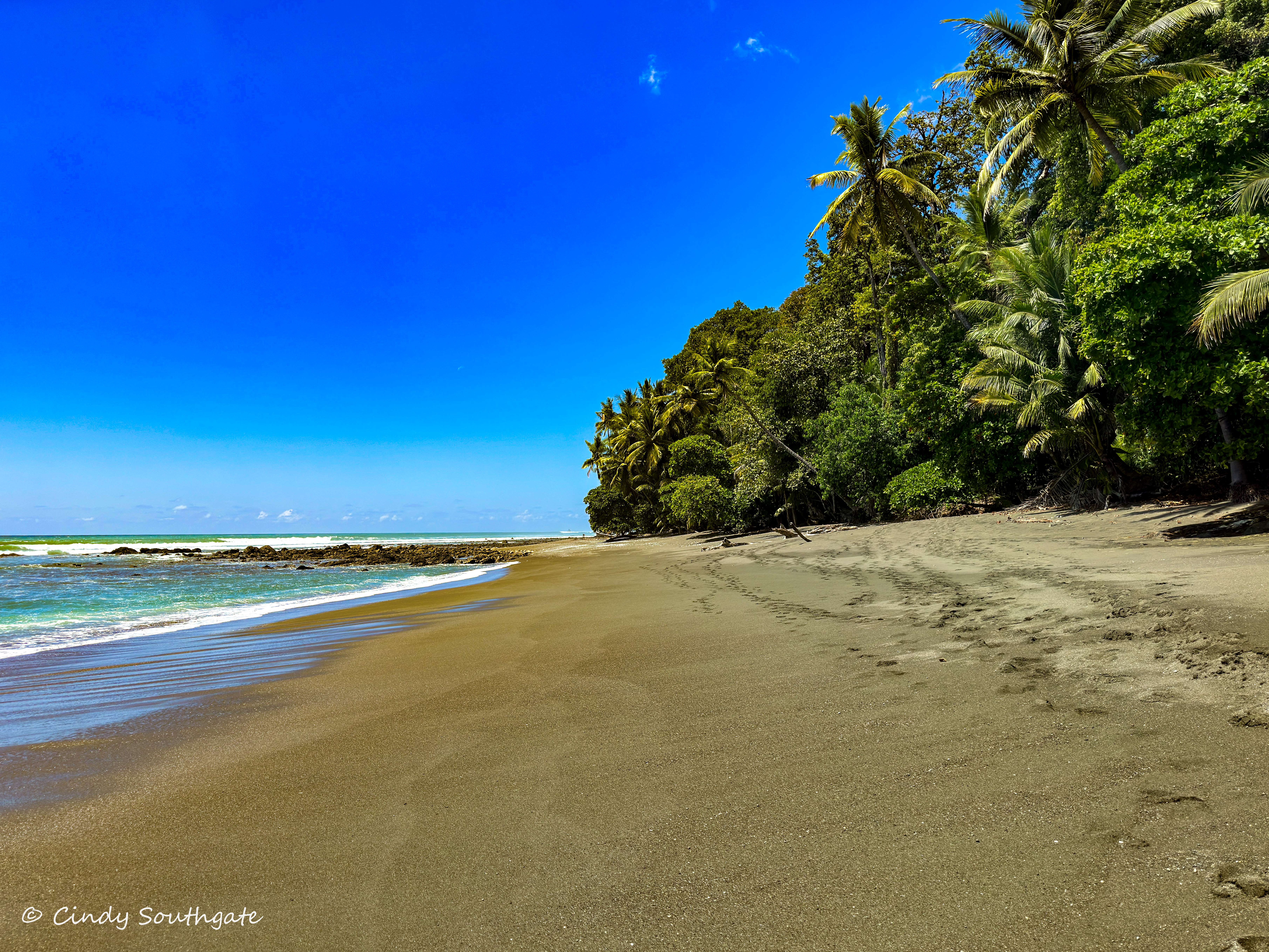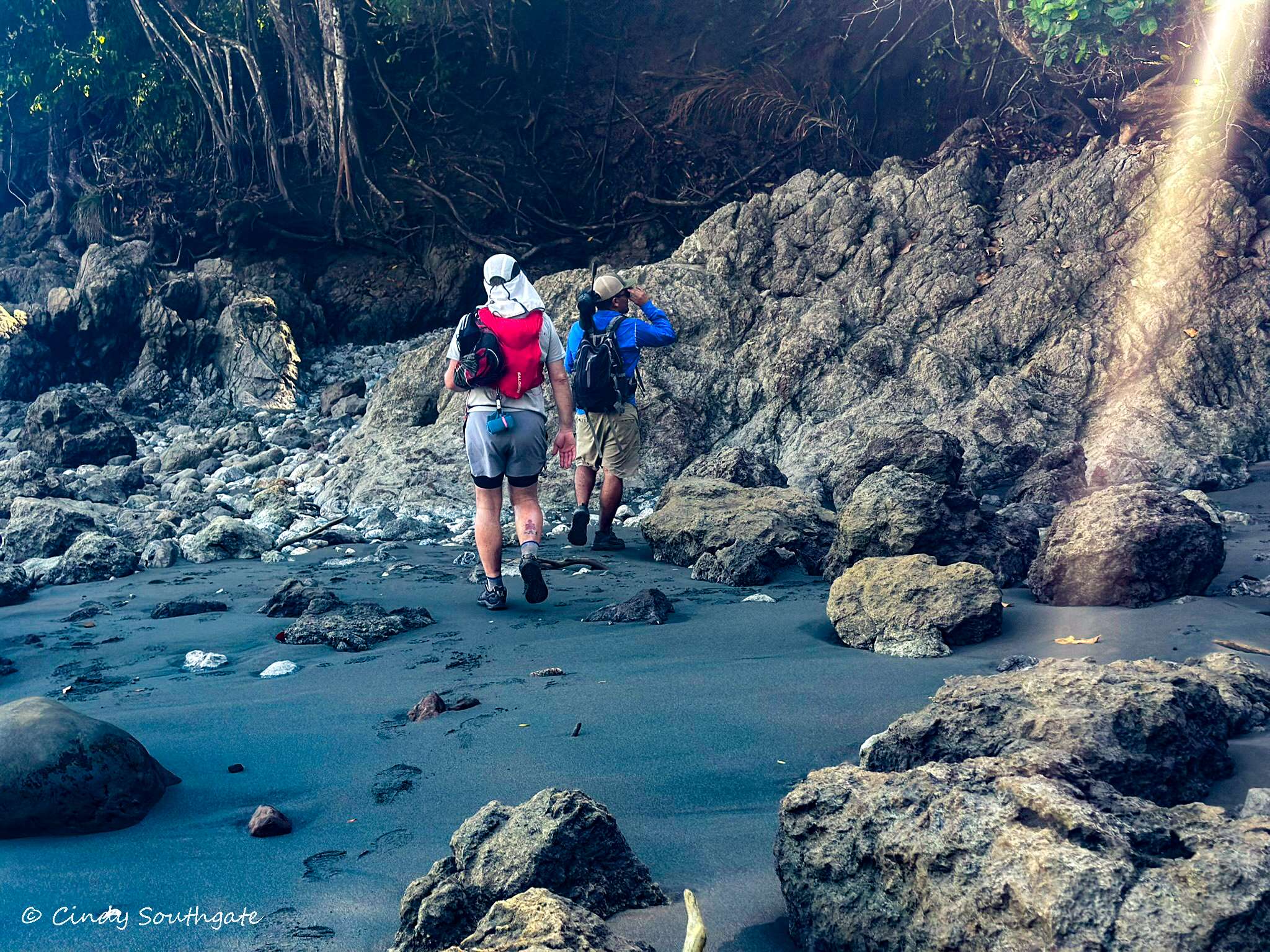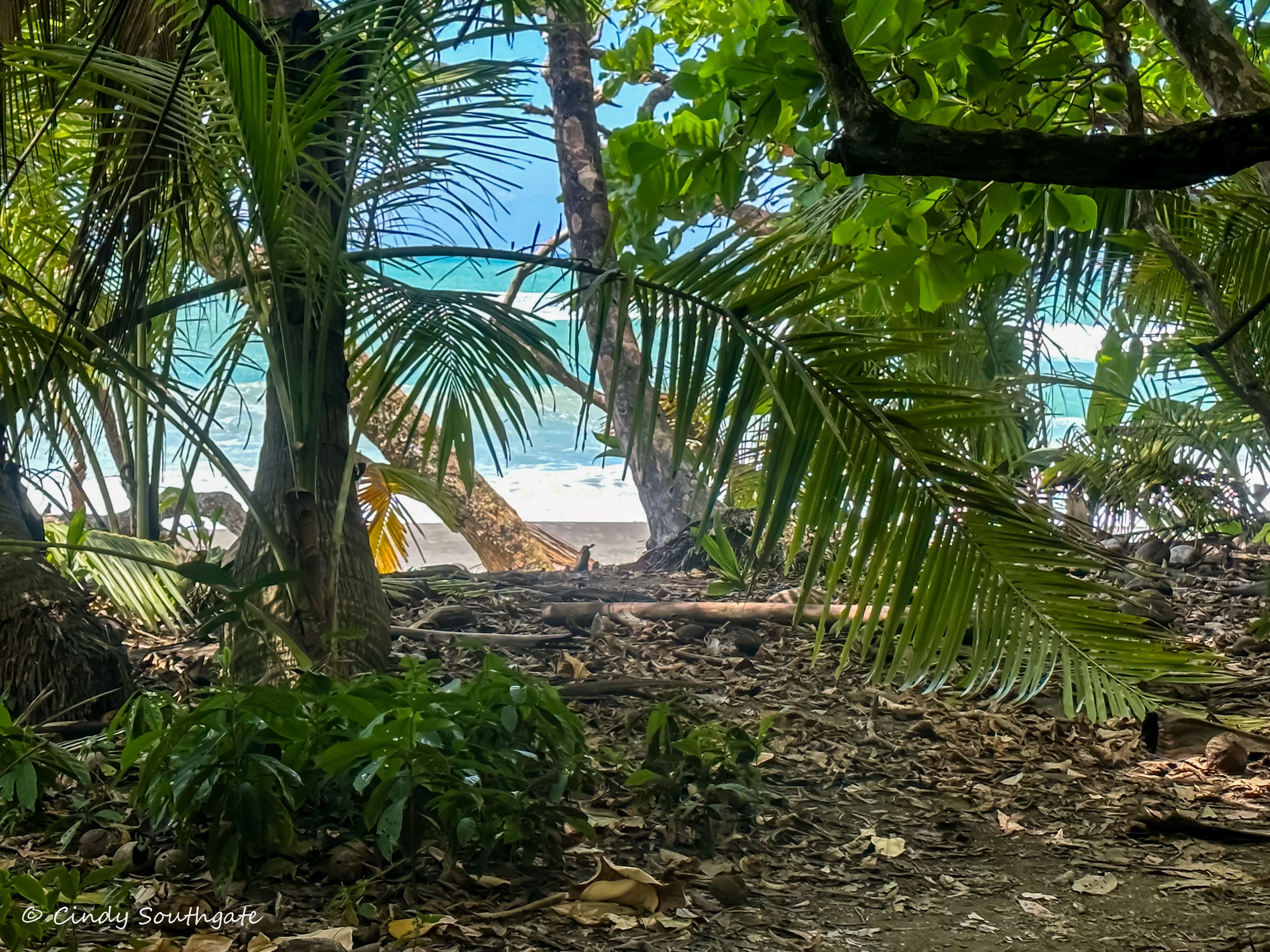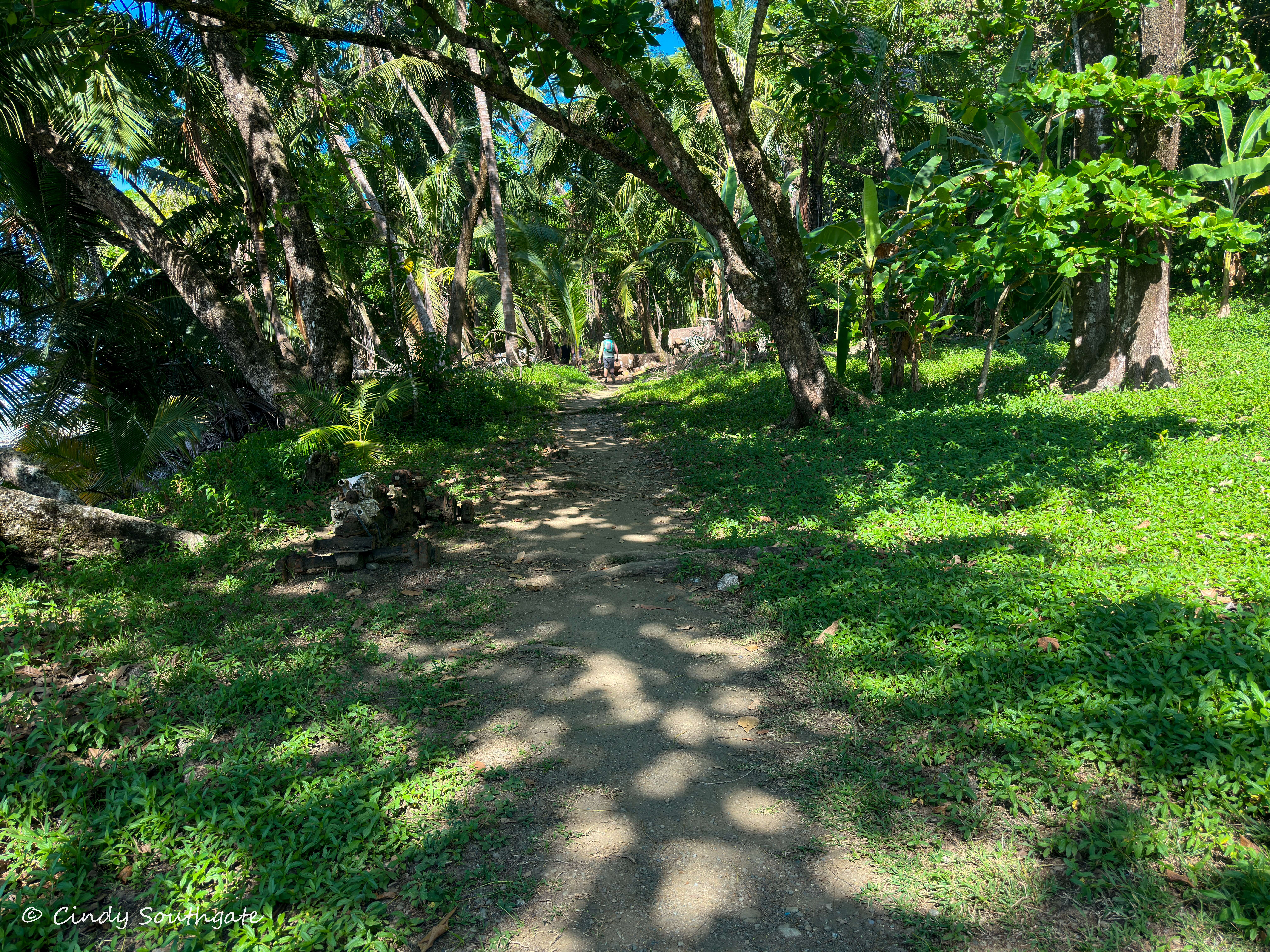 We started our hike by following the trail into the rainforest. Over the day we would alternate between forest trails and the beach. We carried sunscreen and lots of water to offset the hours in the sun and the humidity, which made our already heavy backpack much heavier.