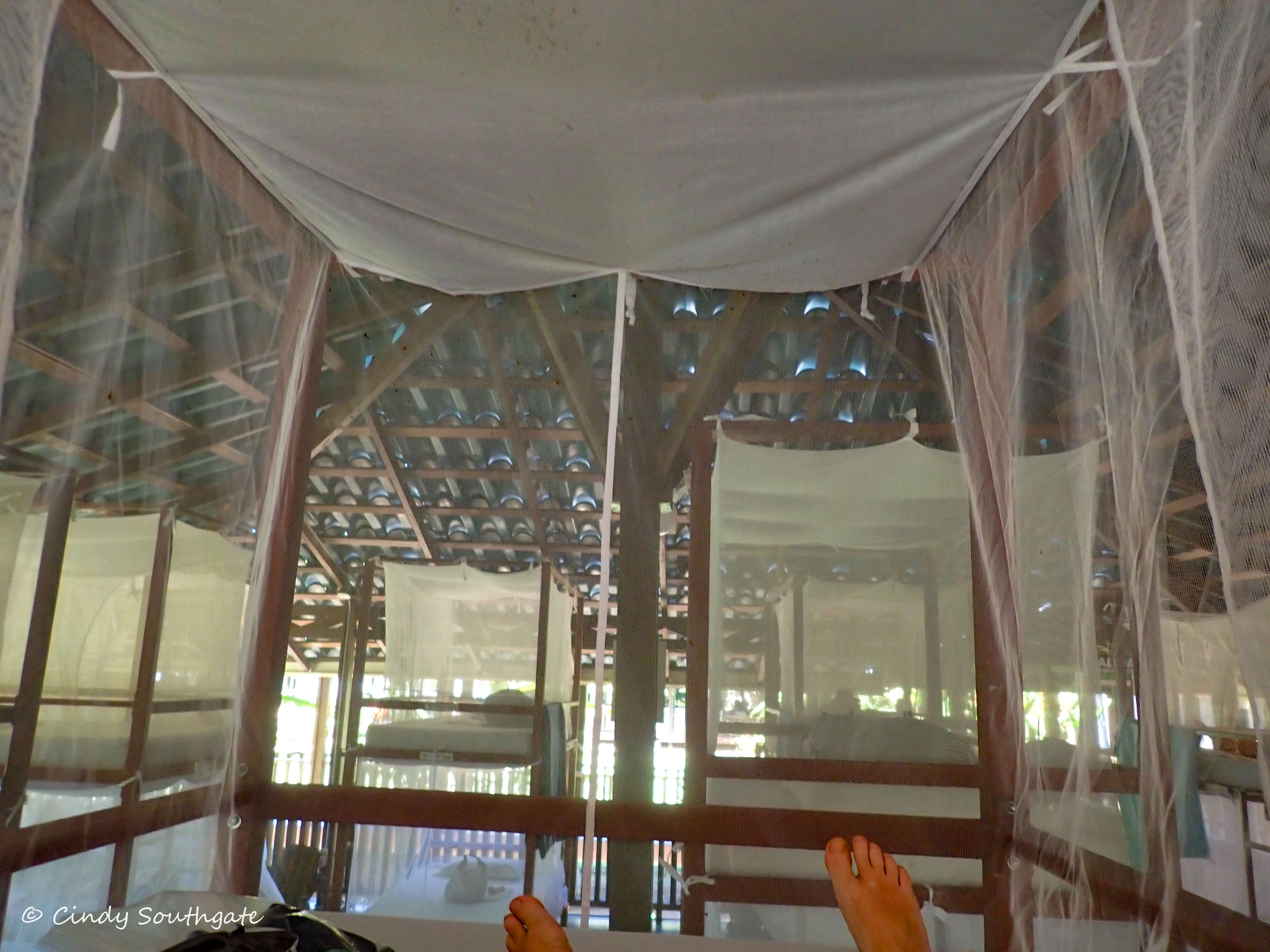 This was not a very romantic place to be in for Valentines day! This is the view from the foot and head of my bed. The bunks were fairly close together and encased in mosquito netting. A sheet and a small pillow were provided. Getting into the top bunk was NOT fun. The ladder had very small metal rungs which dug into my feet and it was a challenge to crawl under the netting into the tiny space. Being short was probably an advantage here because I kept some of my belongings at the bottom of my mattress including a small flashlight in case a nighttime bathroom visit was necessary. We brought our Kobos with us but we didn’t really have time to read. I also had ear plugs and some sleep meds which helped a lot. I hoped for a good sleep as I was looking forward to our full day in Corcovado tomorrow.