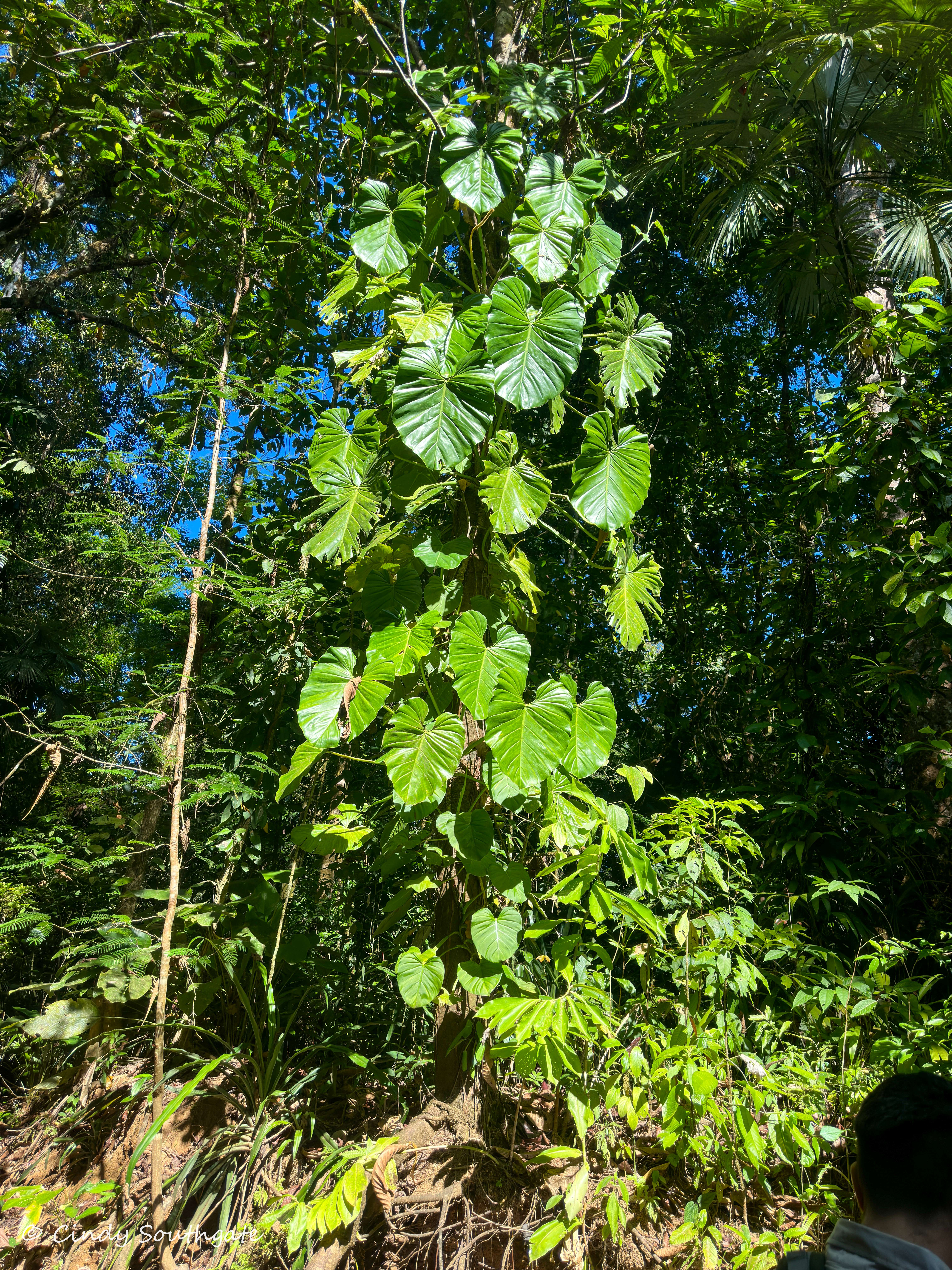 This is a plant you don’t want to touch. If you look closely, there are fire ants on the branches. The queen lives in the dark horn, which is very sharp. The plant and ants have a symbiotic relationship – if you touch the leaves the ants will attack, therefore protecting the plant. The ants also cut down any plants that start to grow nearby and might steal nutrients from their plant. In return, the plant provides a safe home for the queen.