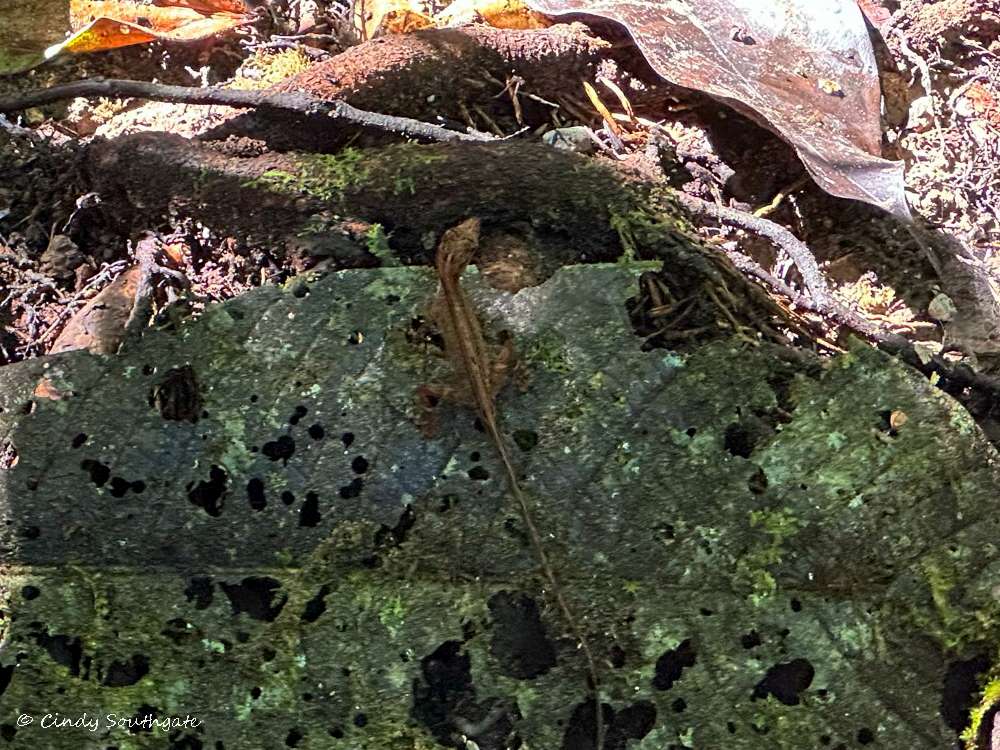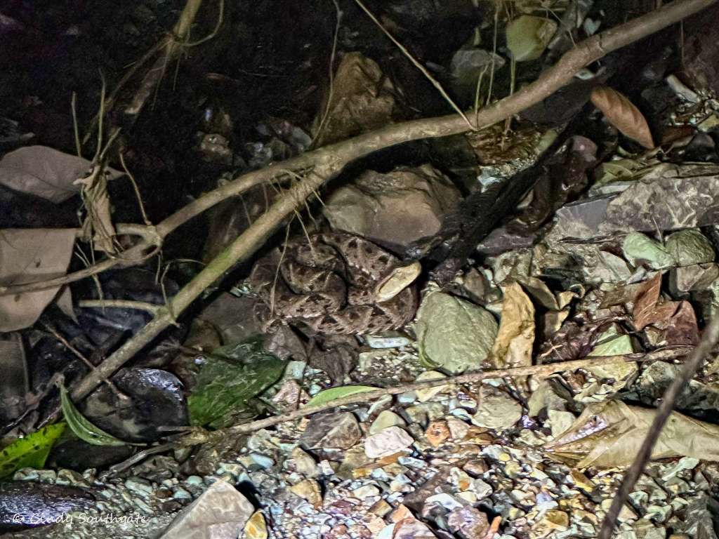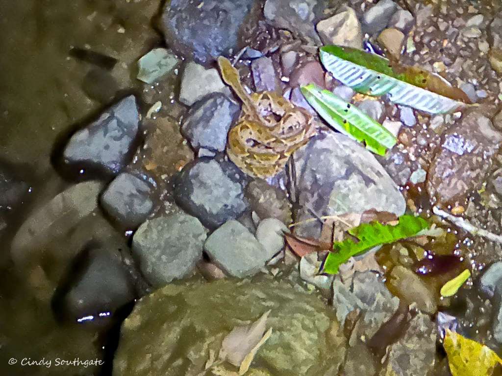 As we were crossing a small wooden bridge, Fernando finally spotted a Fer-de-lance. It was lying down in the creek bed and very hard to spot. This photo has been enlarged quite a bit to make it easier to see.