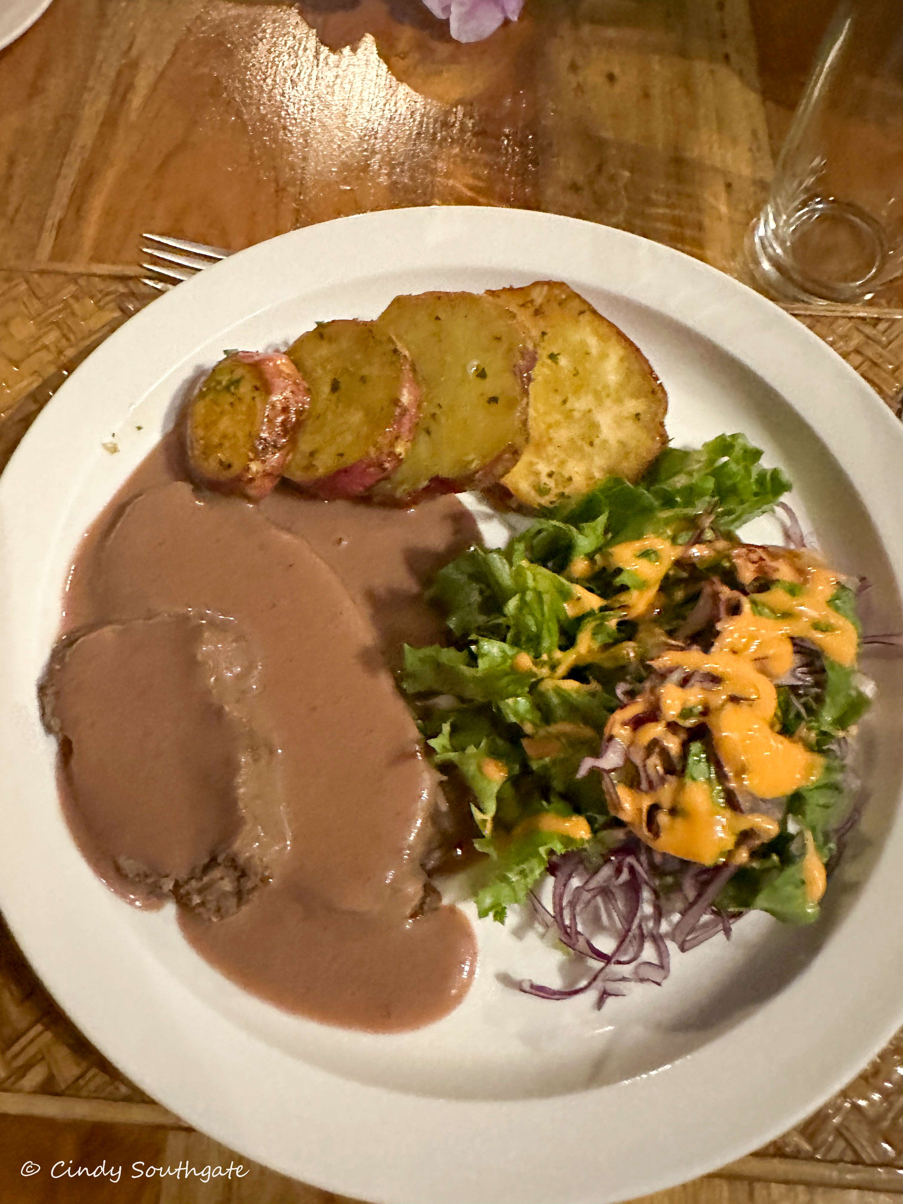 At 7 pm we went down the path, past the pond to the main building for dinner. The food was always enticingly presented.