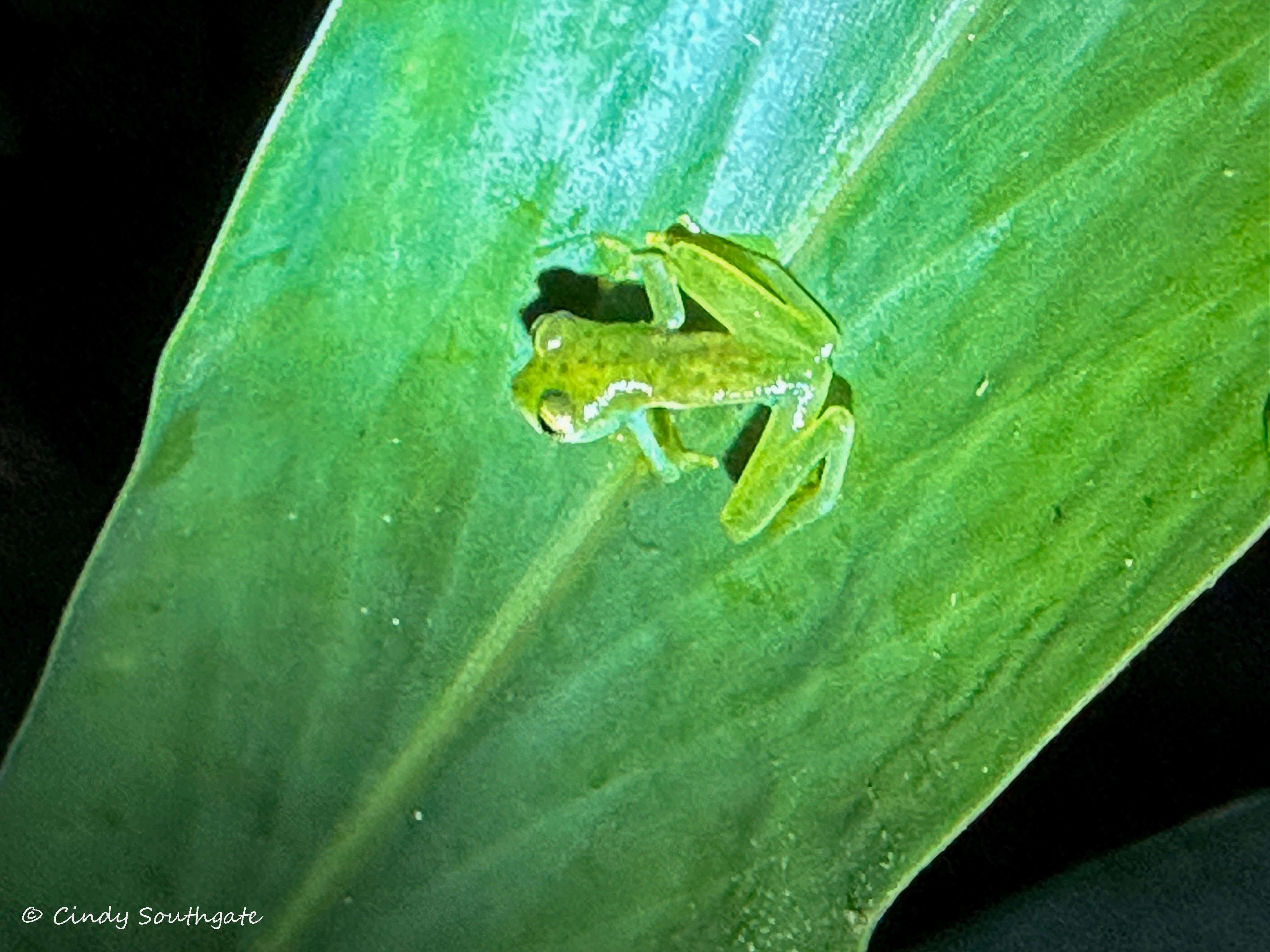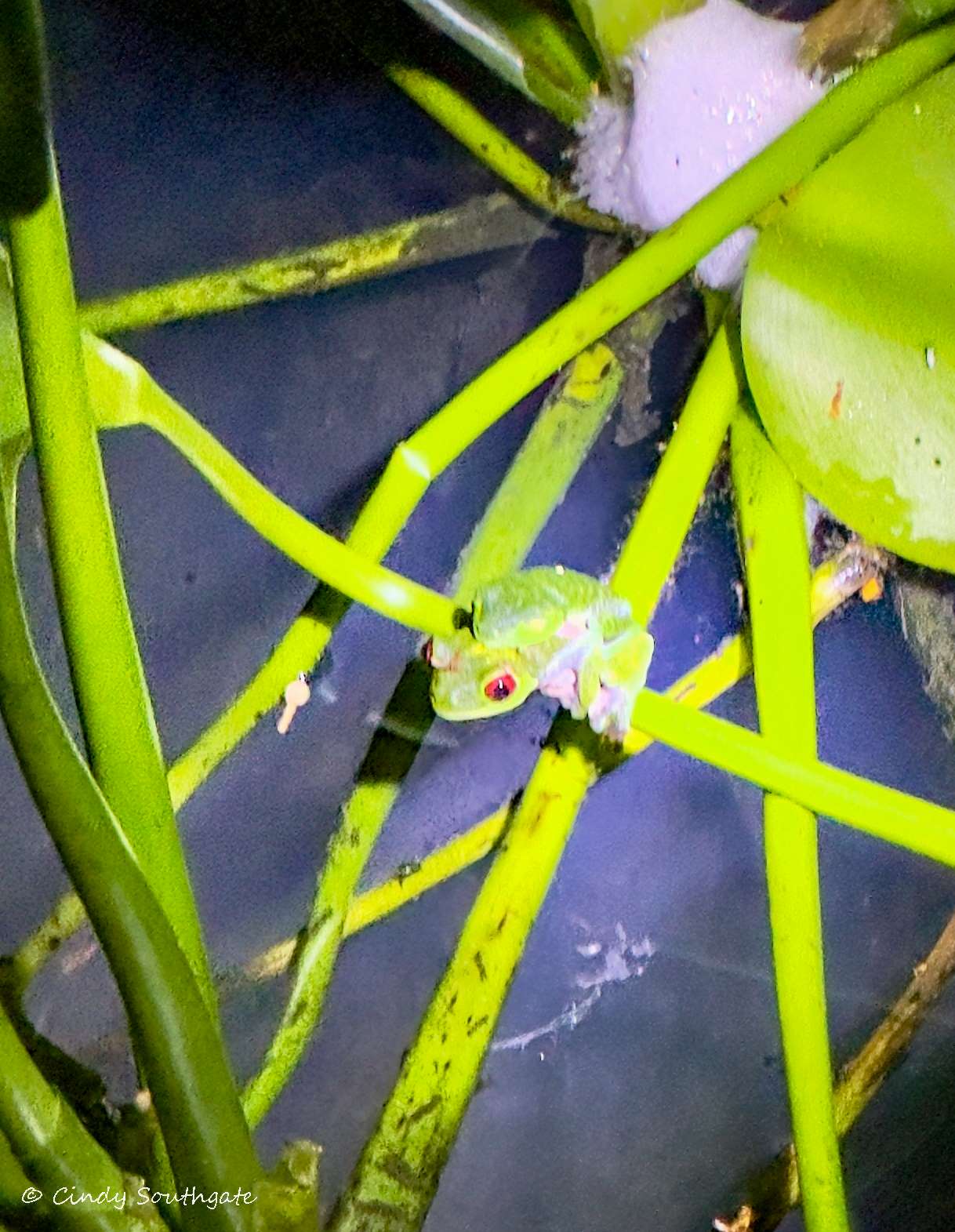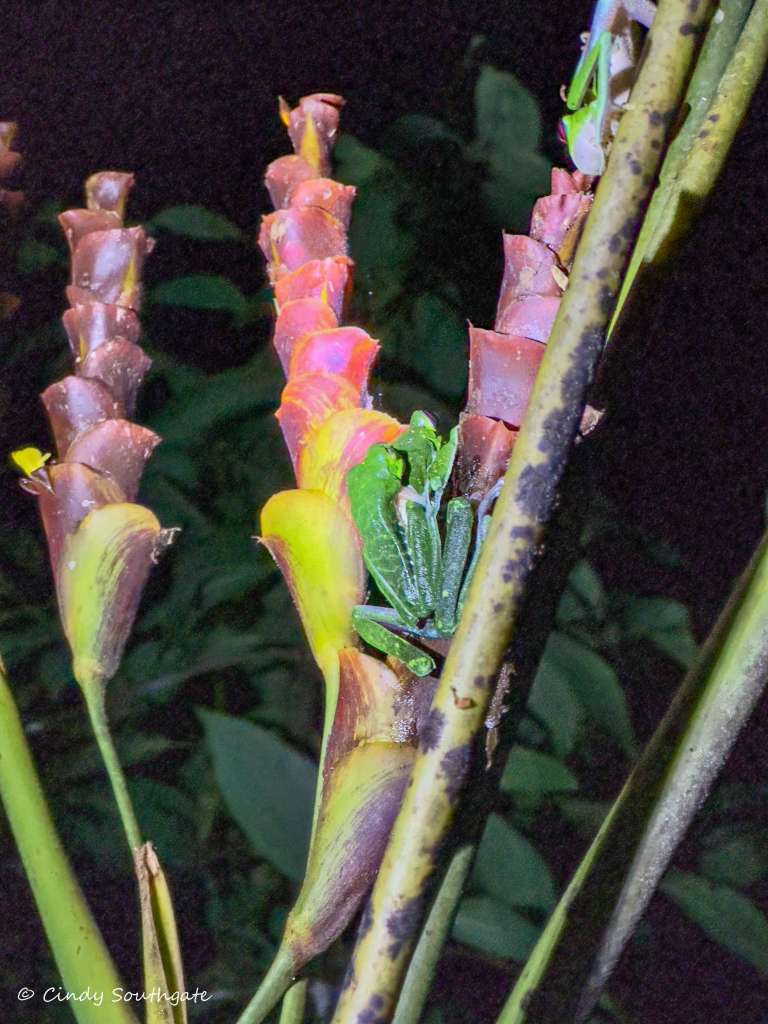 We spent the first part of the tour exploring some tall bushes not too far from the main building. Here we spotted our first Glass Frog of the evening. They are very tiny – only 3 cm long. The female lays her eggs on the underside of a large leaf and the male protects it. During the day he urinates on them to keep them moist.