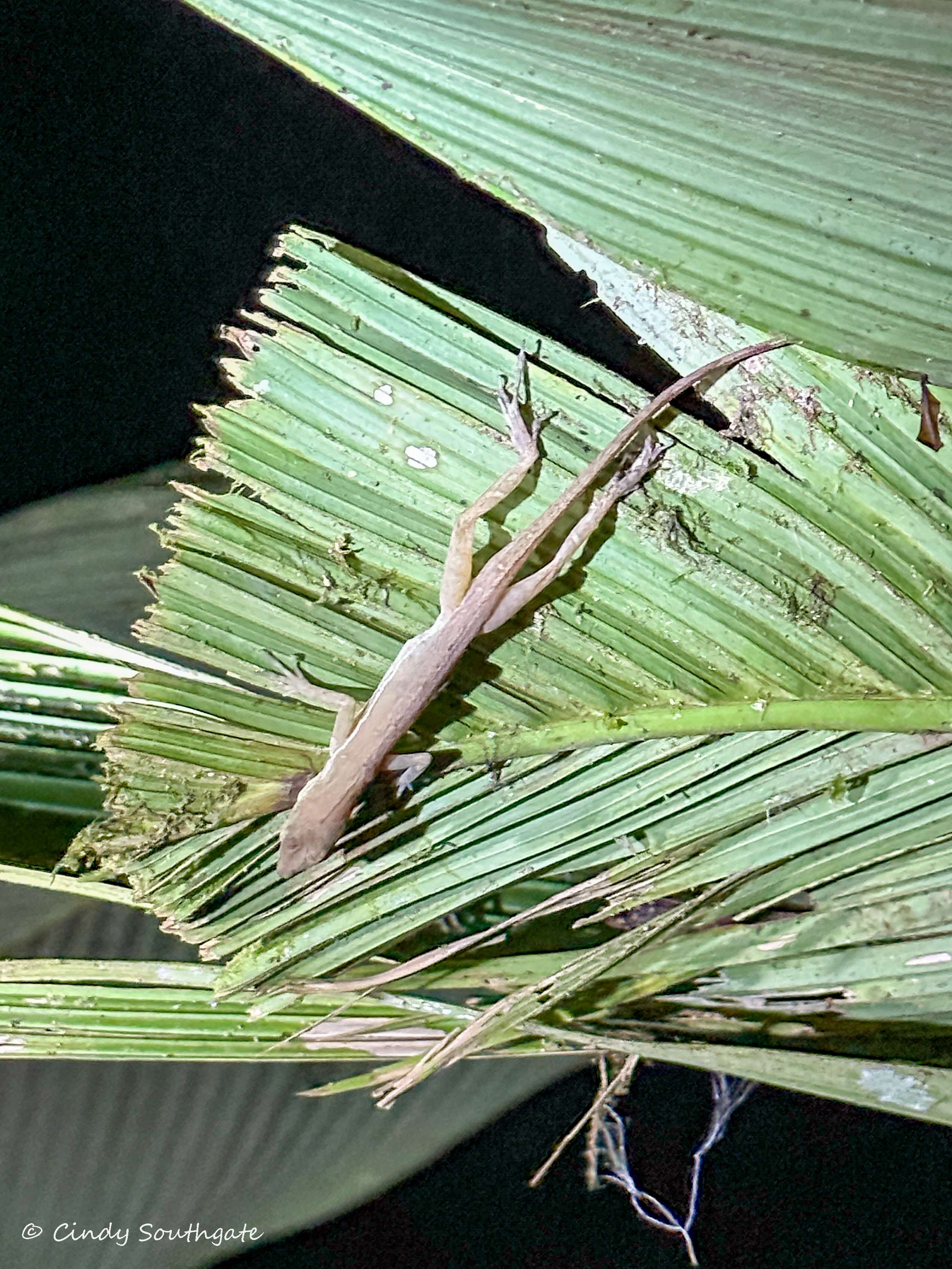 We saw many pairs of Glass Frogs mating as well as a few Red-eyed Tree Frogs. Fernando pointed out what he called a “kissing bug” along with a Wandering Gecko.