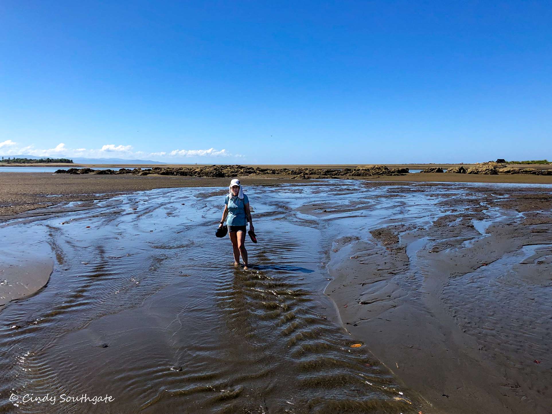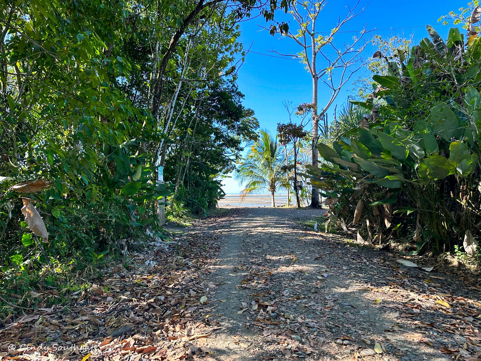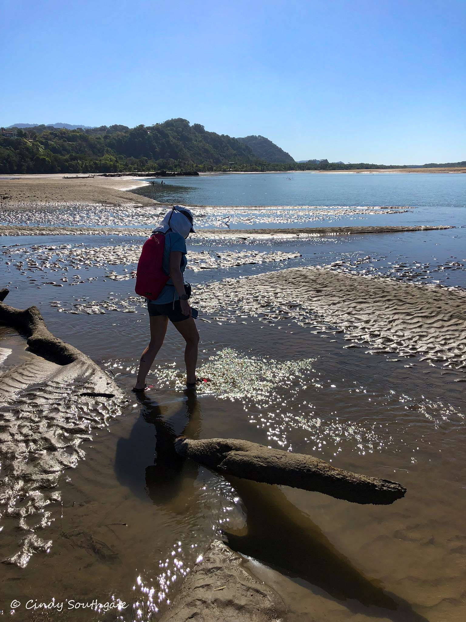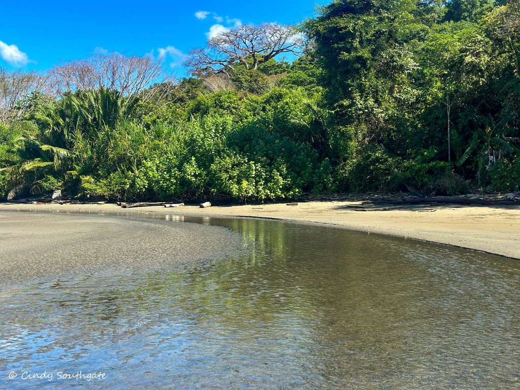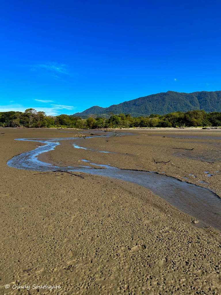 With our stomachs full, we packed our backpacks with water shoes and water. We headed down the steep hill towards the main road. We commented that it was going to be tougher going back up as the day got warmer. We had to walk briefly down the side of the main highway. There was a very small sign pointing to the beach. We turned down a small gravel road and it brought us out beside a small river which was flowing very slowly into the ocean.