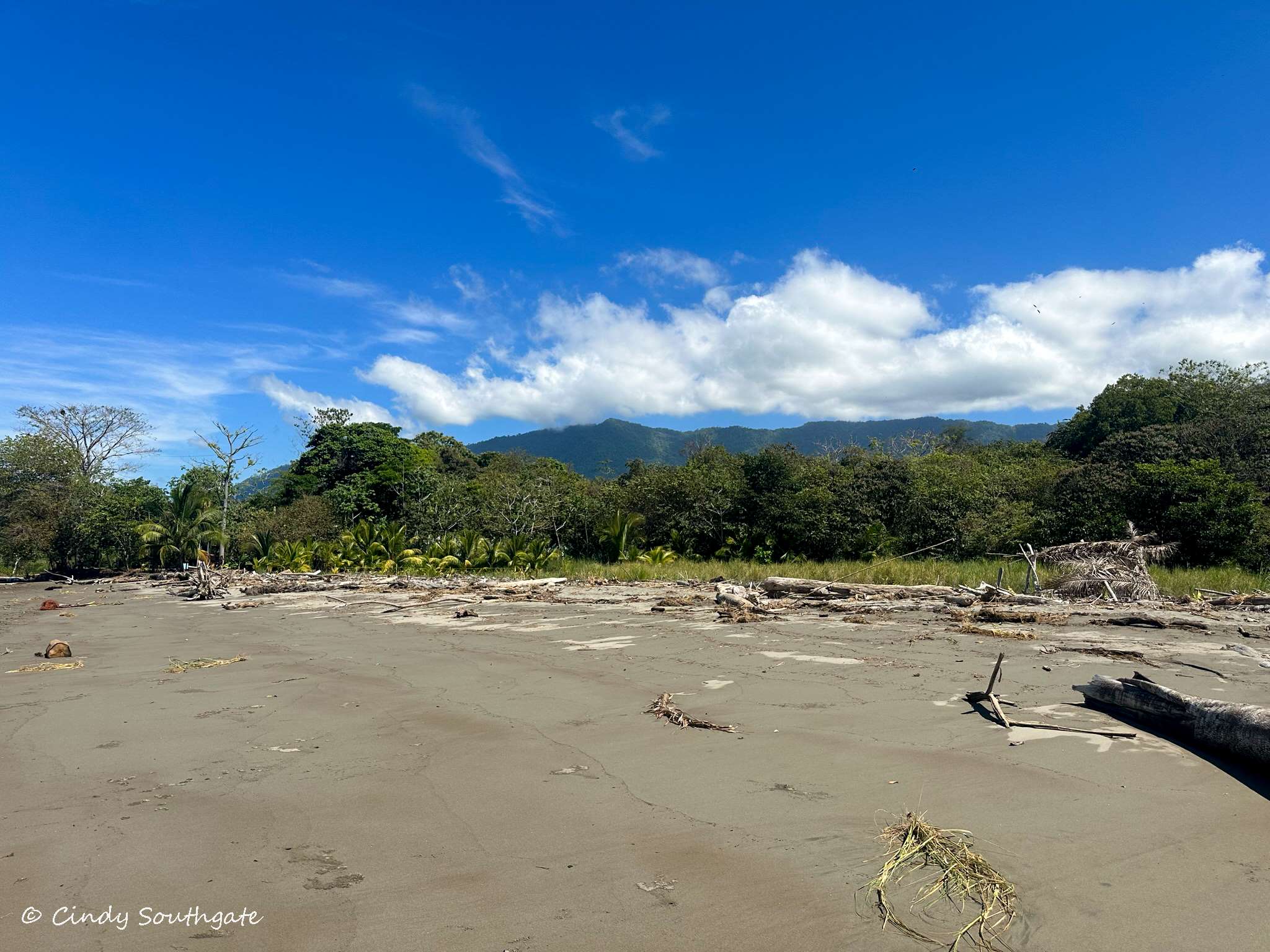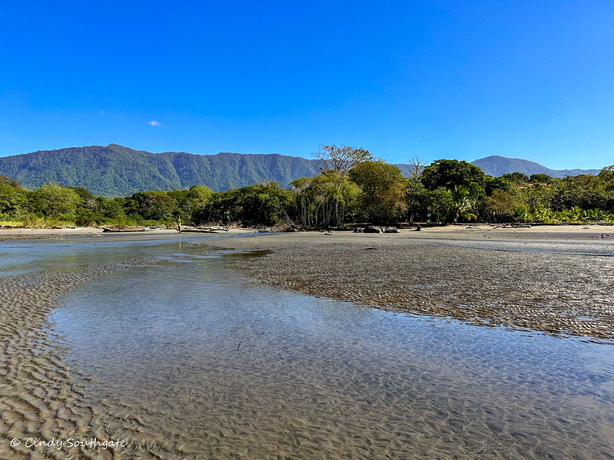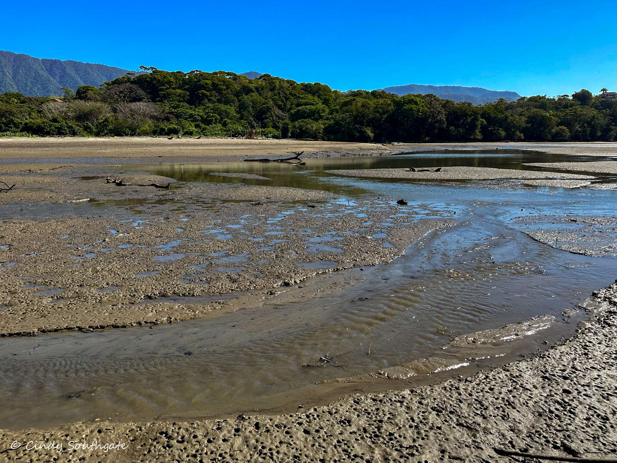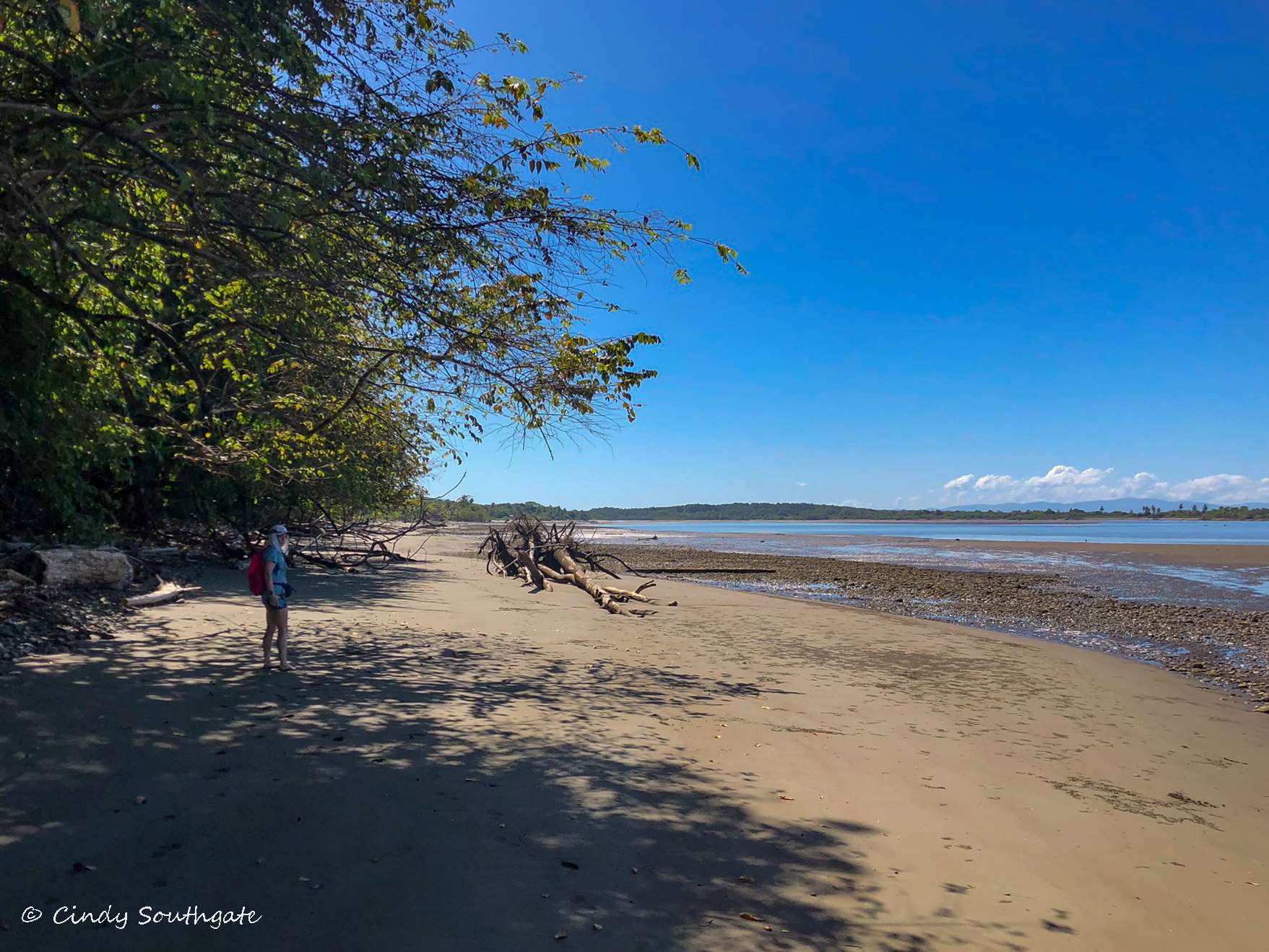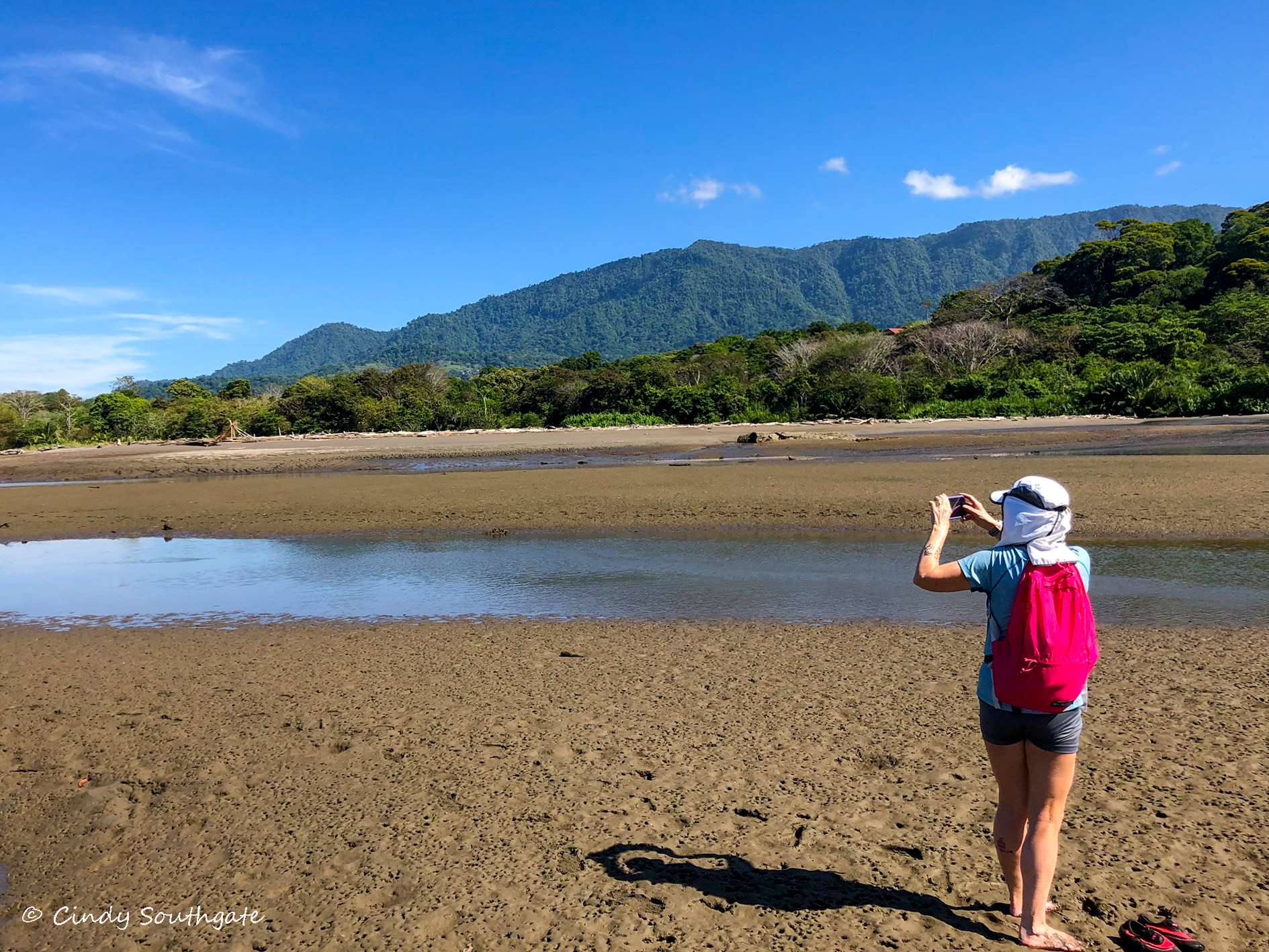 With our stomachs full, we packed our backpacks with water shoes and water. We headed down the steep hill towards the main road. We commented that it was going to be tougher going back up as the day got warmer. We had to walk briefly down the side of the main highway. There was a very small sign pointing to the beach. We turned down a small gravel road and it brought us out beside a small river which was flowing very slowly into the ocean.