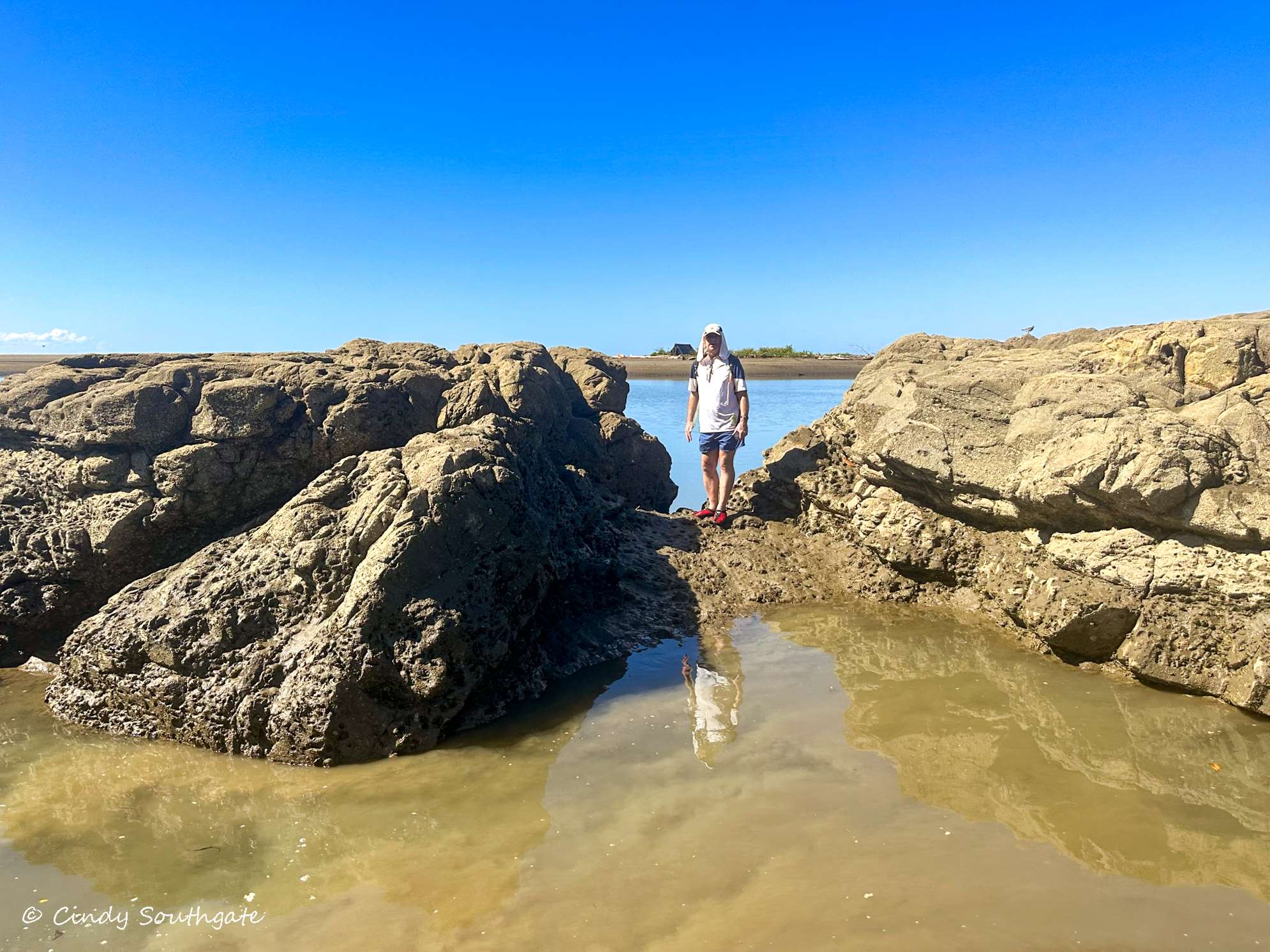 We walked as far out as we could and then turned to walk parallel to the shore. Mike waded through the mud to explore the giant rocks.