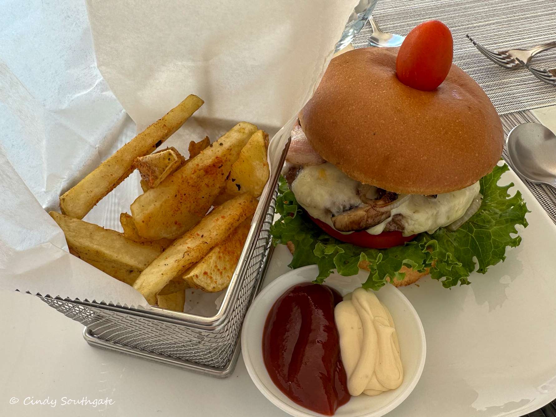 Mike and I shared a burger and fries for lunch at one of the little tables by the steps to the pool. When we were finished, we sat in the lounge chairs there to read until the sun started to peek through the awning. We didn’t want to be in the sun so we moved over to the side of the pool under the umbrellas.