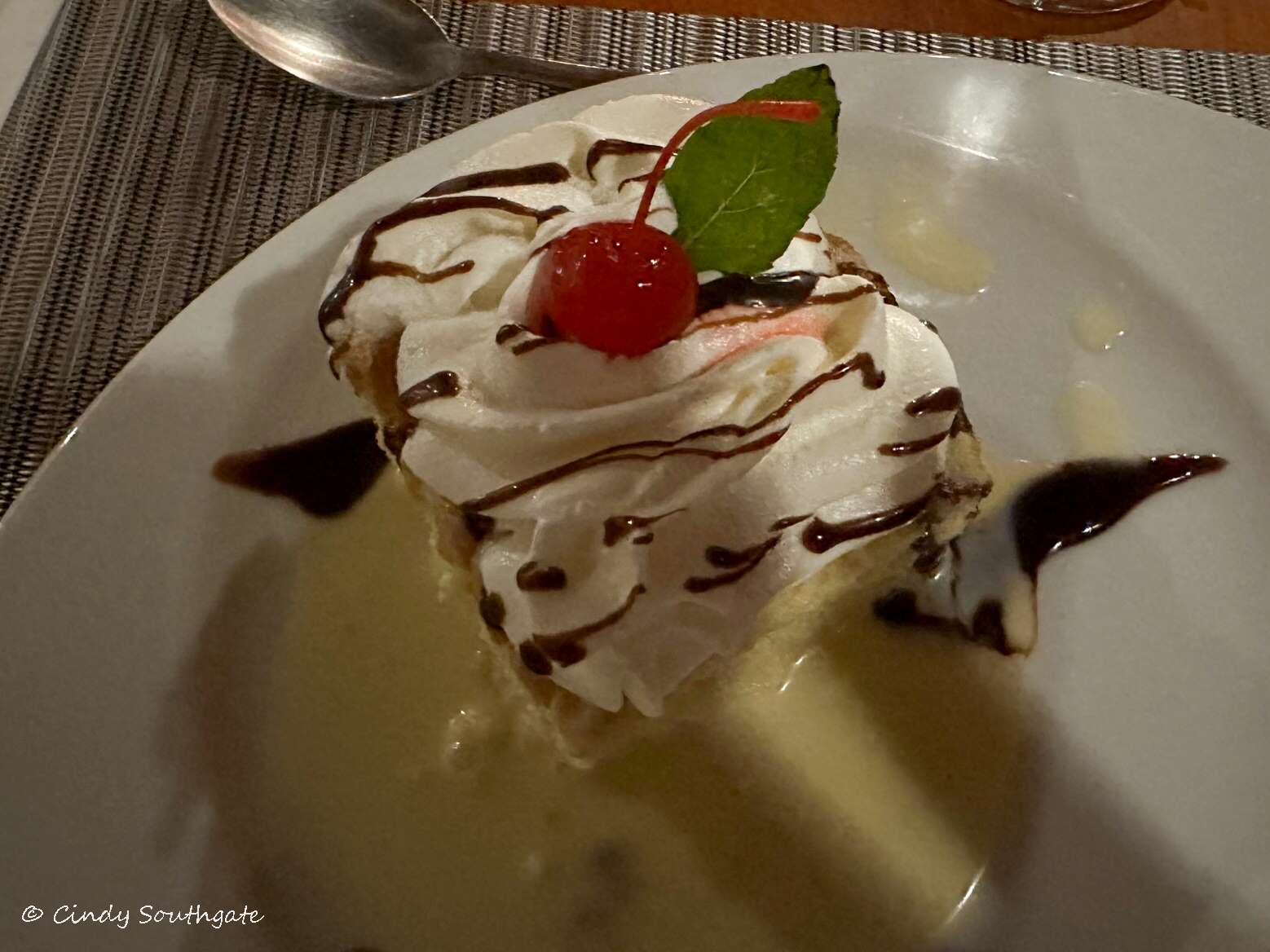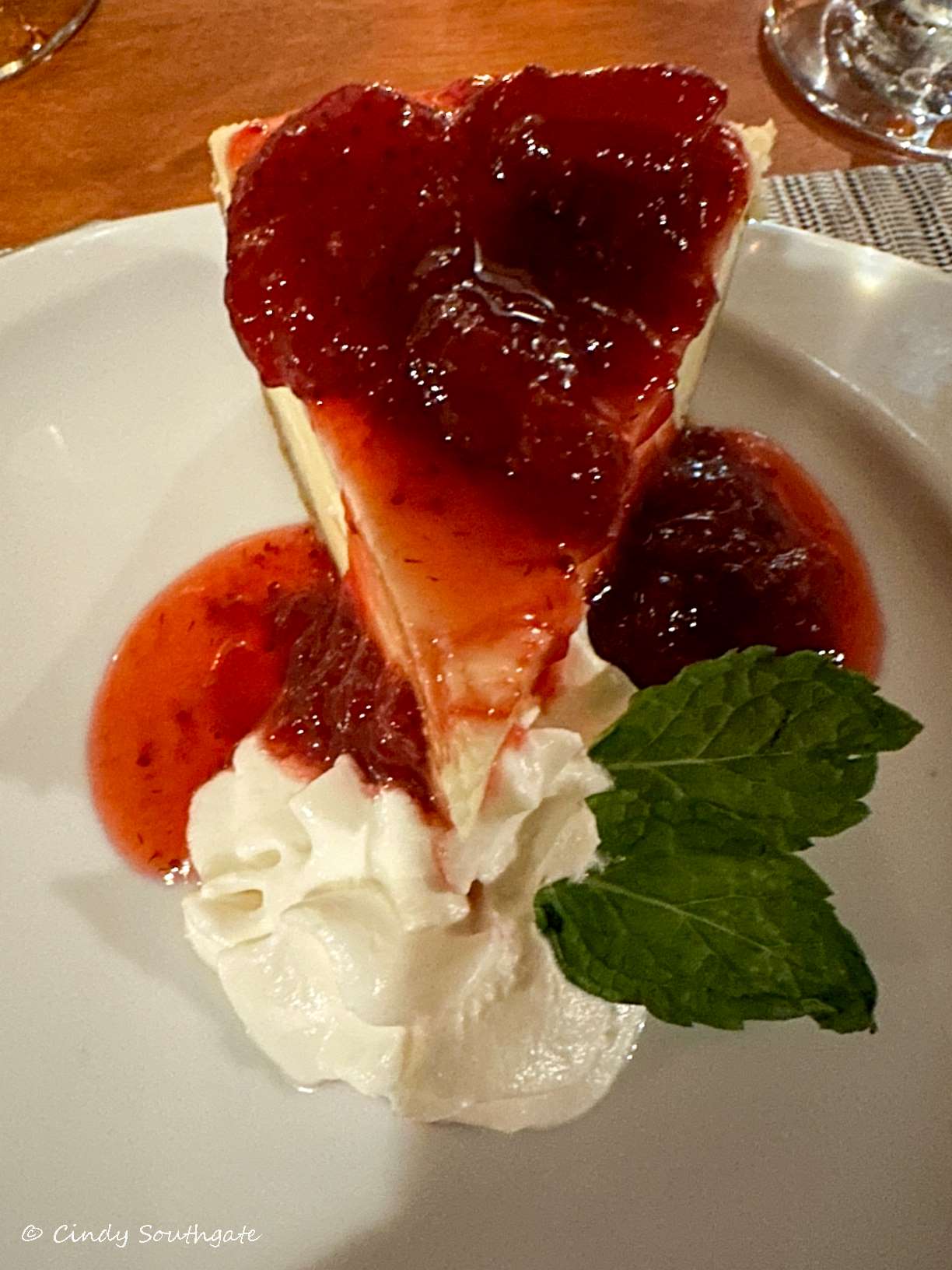 For dinner we shared the beef tenderloin. I can’t eat a huge meal so sharing with Mike works well. We save room for dessert and save a lot of money. Tonight for dessert I had Strawberry Cheesecake and Mike had Tres Leche, which was a light cake with milk. Both were very good.